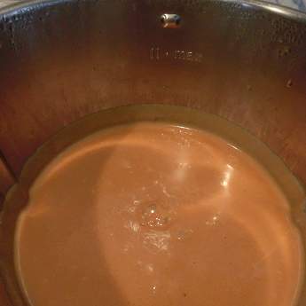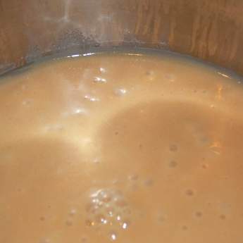 il composto fotografato dopo i primi 20 minuti di cottura a 100°. come si nota il colore è chiaro appena appena paglierino la consistenza è liquida