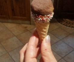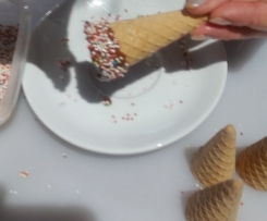 - A questo punto prendere i nostri conetti di cialda e passateli prima nel cioccolato e poi fate aderire le granelle di zucchero colorate e poi sopra posizionate la nostra pallina e premete un po' per fare aderire e fate cosi fino a finire i vostri finti gelati