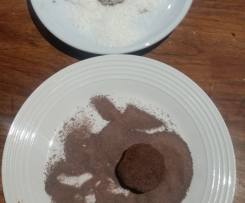 - Ora prendete il nostro impasto dal frigo e cominciate a fare delle palline un po piu' grosse di una noce e passatene alcune nel cacao amaro e altre nel cocco grattuggiato