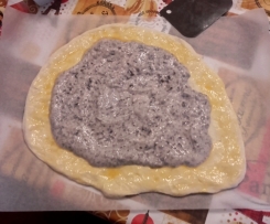 Stendere un panetto (aiutandosi con la farina) spennellare il bordo con l'uovo sbattuto e, mettere la farcia al centro. - Stendere il secondo panetto e sovrapporre al primo, con una rotella dare la forma a ♡.