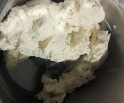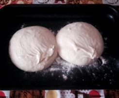 Togliere l'impasto, lavorare a mano e mettere a riposare in una ciotola sporca di farina sigillata con pellicola una mezzora. - Dividere in 2 panetti uguali e far riposare fino al raddoppio.