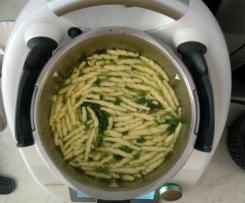 "coperchio chiuso" versare l'acqua e portare a bollore 10 min 100° vel 1. Quando l'acqua bolle versare le trofie e le rimanenti cime di rapa e cuocere per 7 min 100°