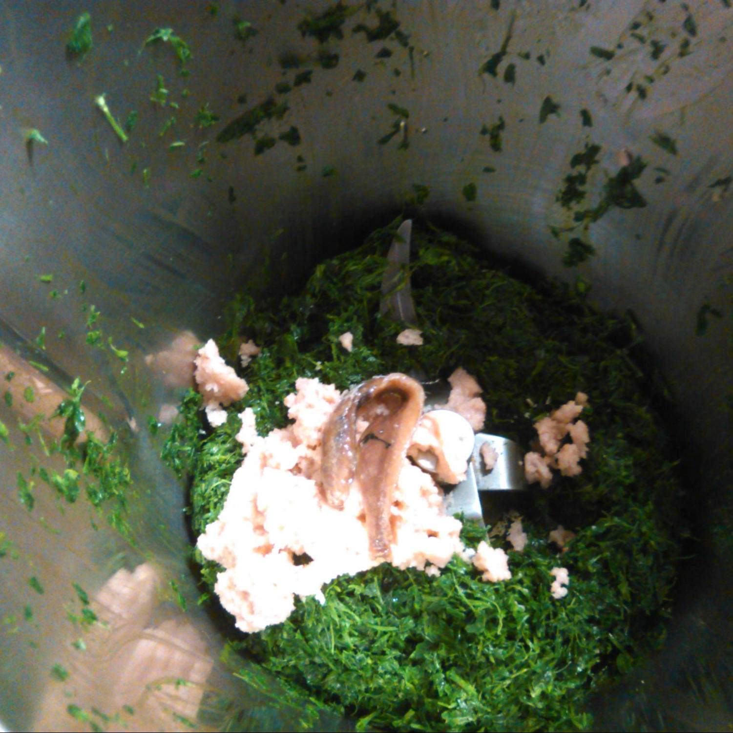 Aggiungere nel boccale, la mollica con l'aceto, 1 filetto d'acciuga e poco sale. 10" vel. 7