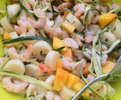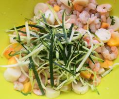 - Una volta pronto i gamberetti quando saranno freddi uniteli alla pesca il cuore di Palma la zucchina tagliata a julienne