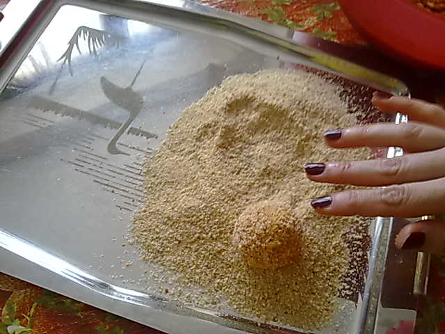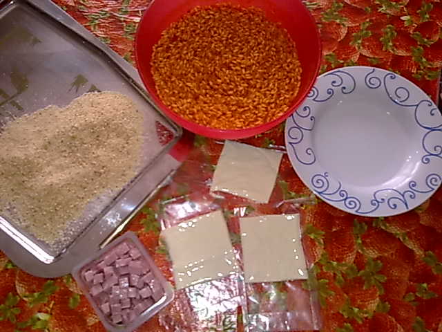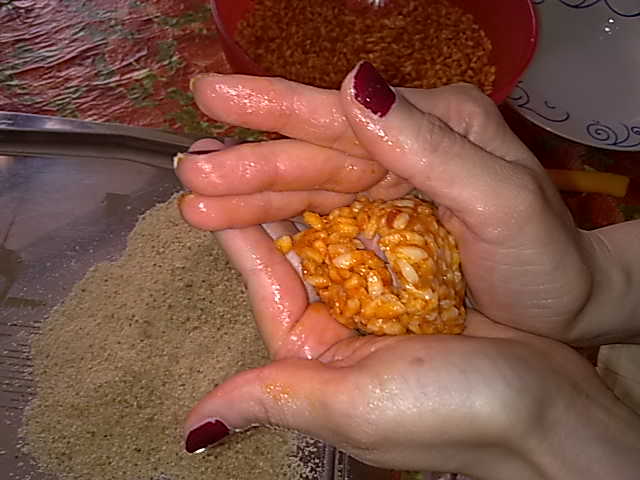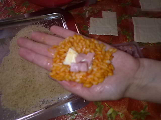 Prima di impallinare, preparare tutto l'occorrente: sottiletta già tagliata, cubetti di prosciutto, vassoio con il pangrattato, un piatto fondo con l'acqua (che vi servirà per bagnarvi il palmo delle mani, prima di impallinare ogni arancino), vassoio dove mettere l'arancino pronto per essere fritto.