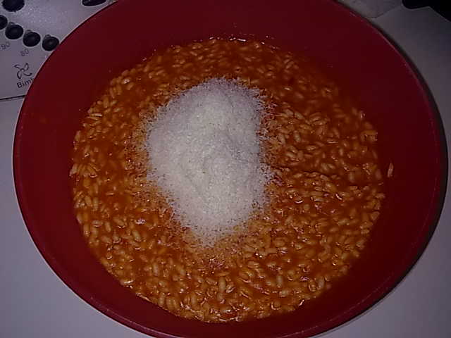 Versare il riso in un contenitore, aggiungere il parmigiano e lasciare raffreddare (io, solitamente, lo preparo il giorno prima, ma bastano anche tre ore).