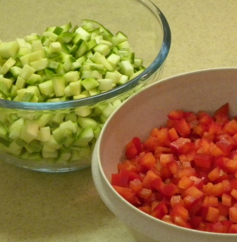 Private il peperone dai semi e dai filamenti interni, spuntate le zucchine e riducete entrambi a dadini.