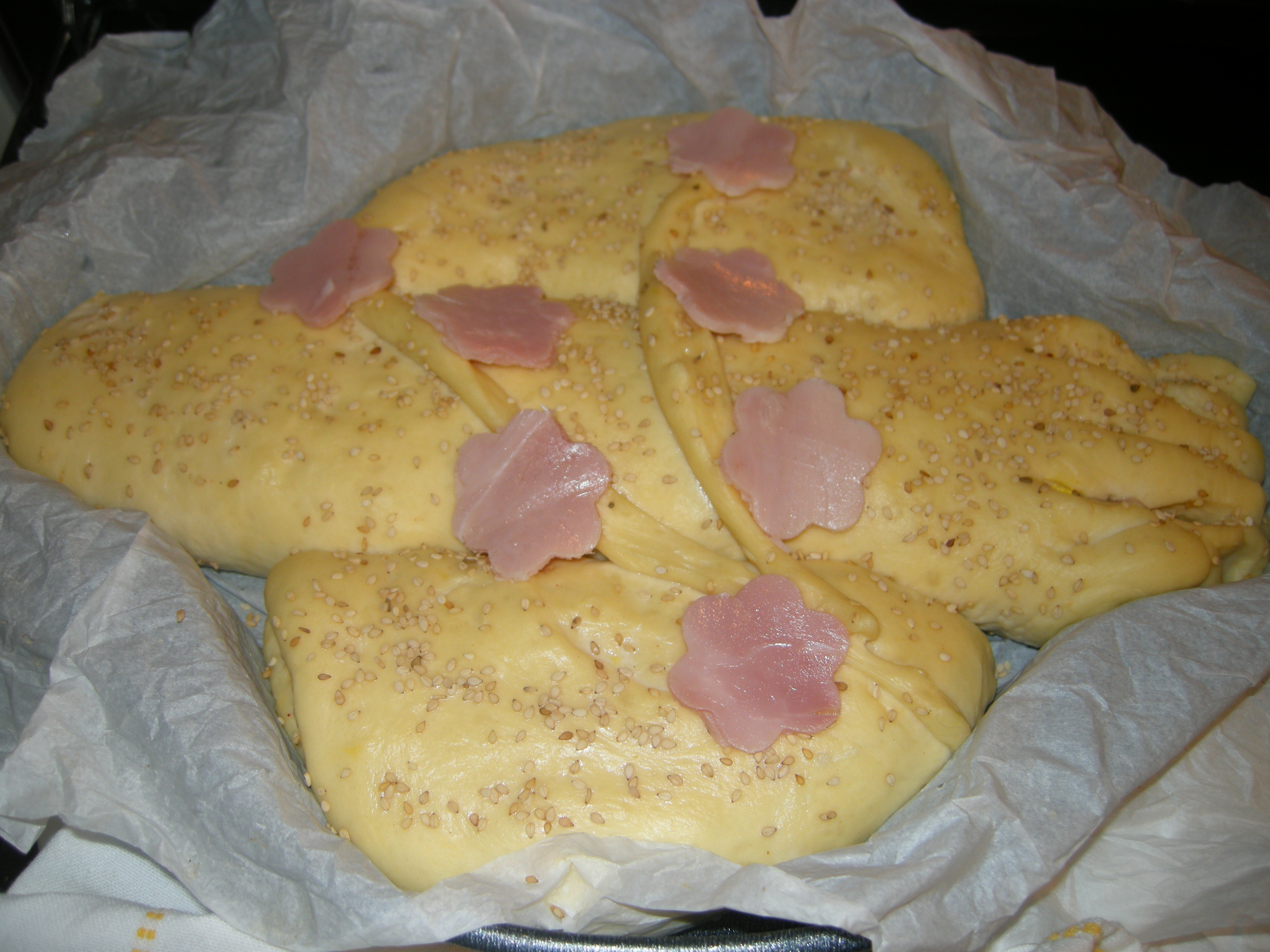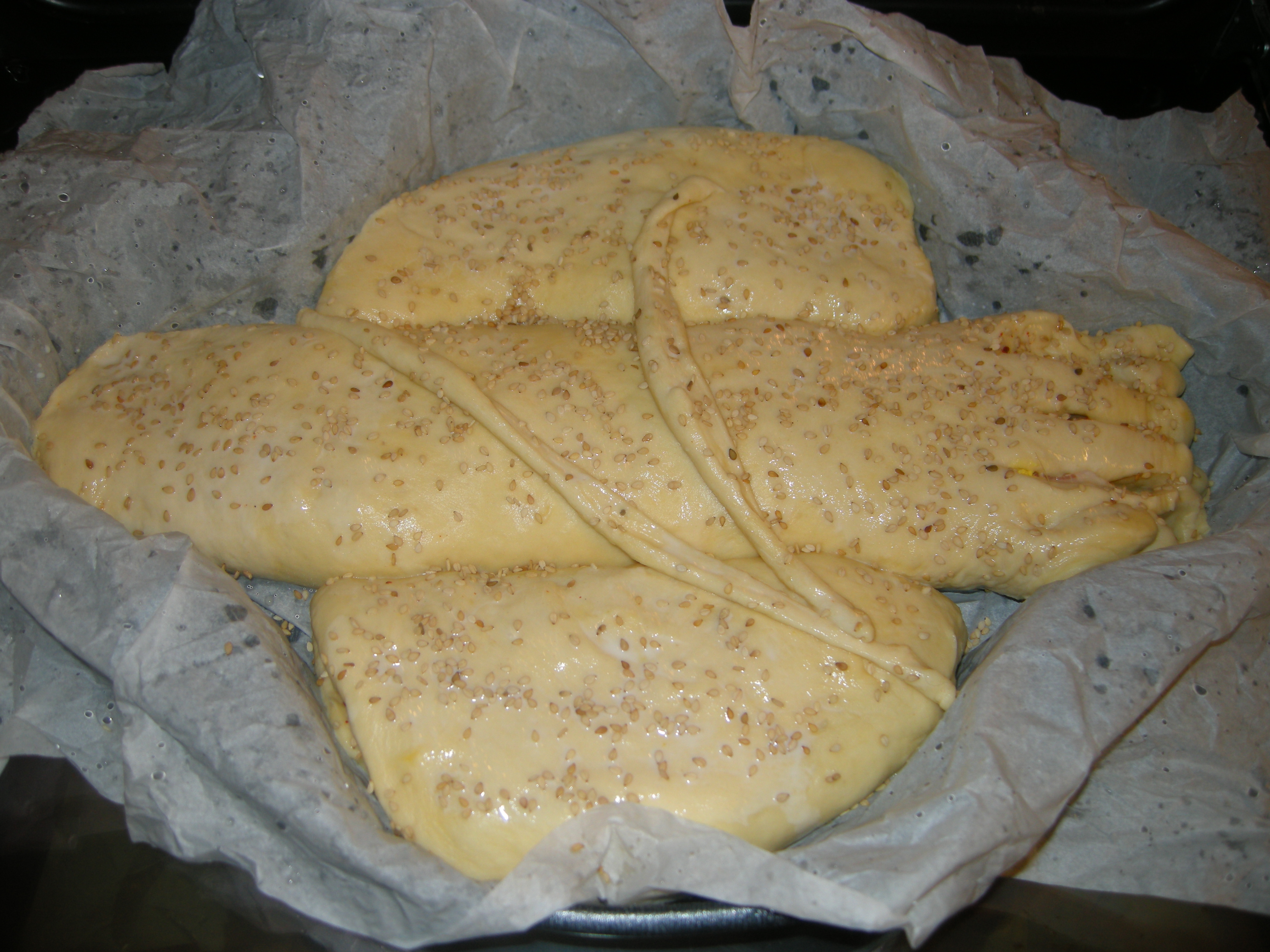 e sistemare al posto delle ali. - Disporre la pasta messa da parte come un ramo che attraversa la colomba. Spennellare la colomba con il latte e distribuire i semi di sesamo. Lasciare lievitare altri 30 min.
