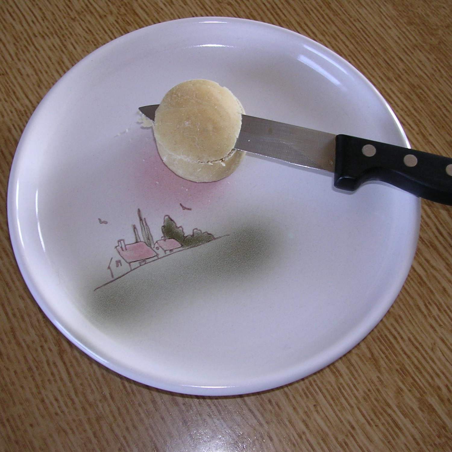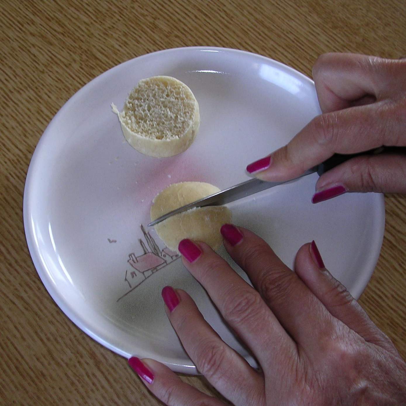 Tagliare una piccola calotta ai panini e tagliarla in due per il senso della lunghezza.
