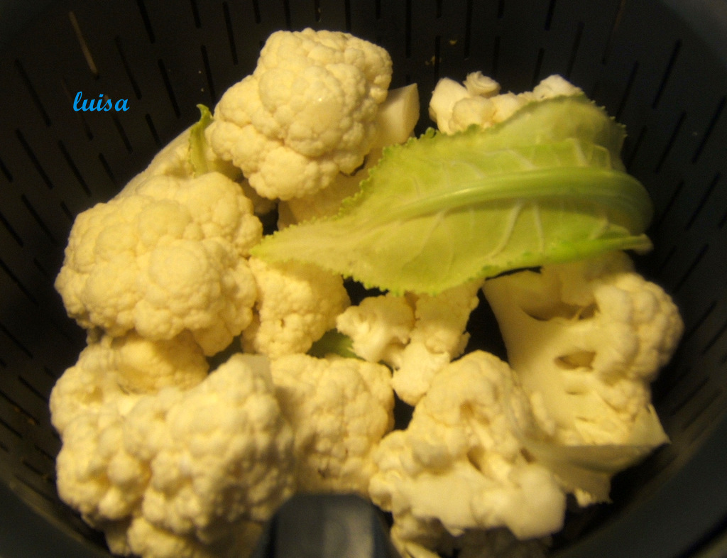 Togliere il cavolfiore dal cestello e usando quest'ultimo come colino, buttare l'acqua rimasta, aggiungere al porro, l'olio e l'aceto, controllare di sale e frullare: 20 sec vel 5-6, 10 sec vel 8