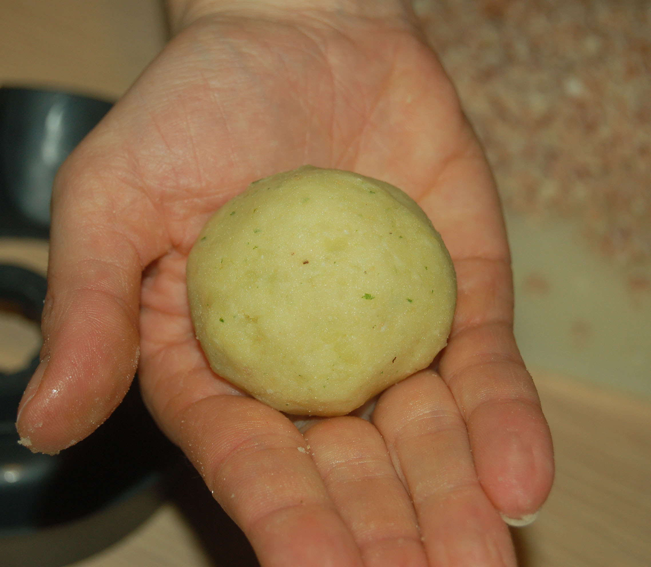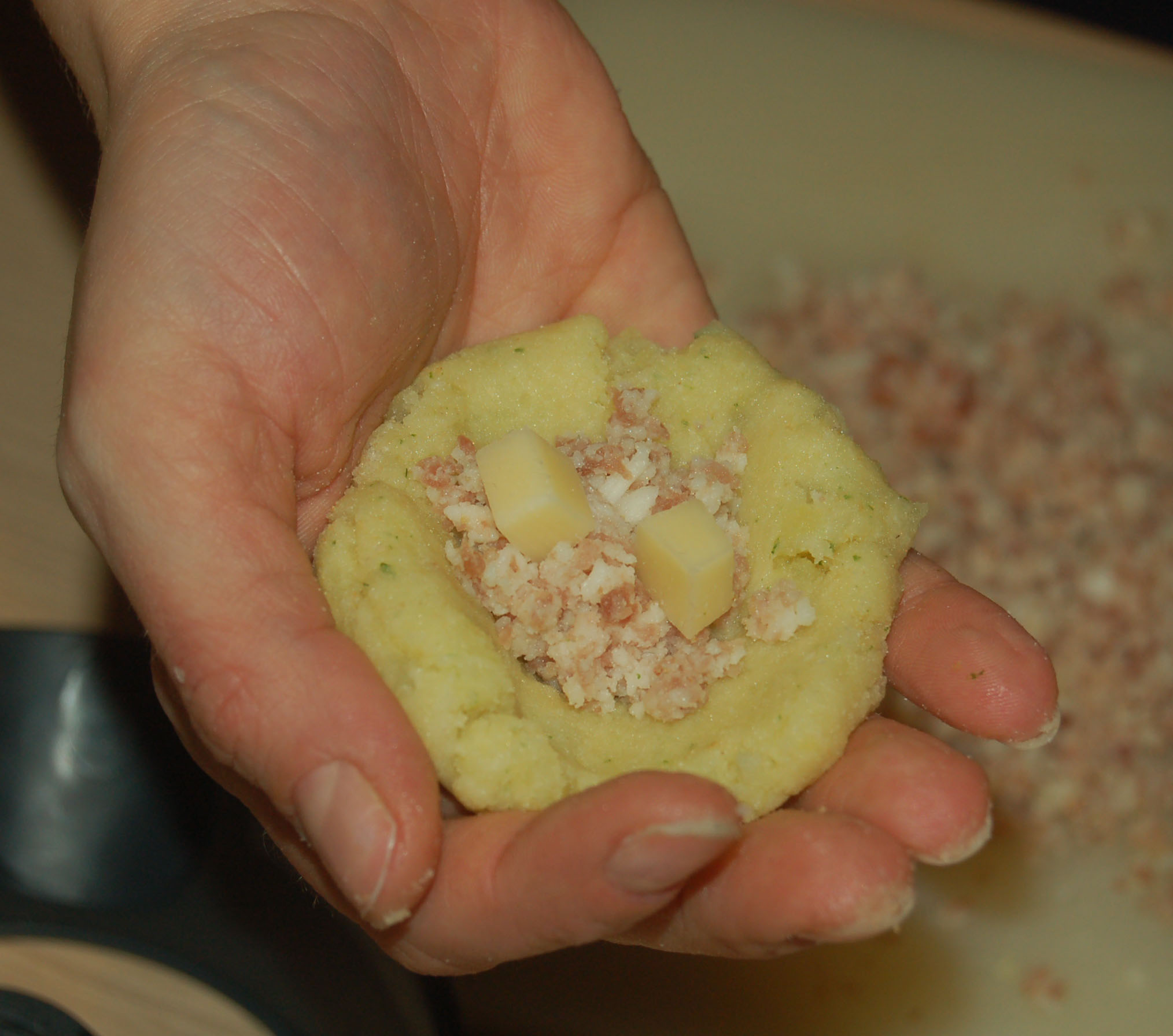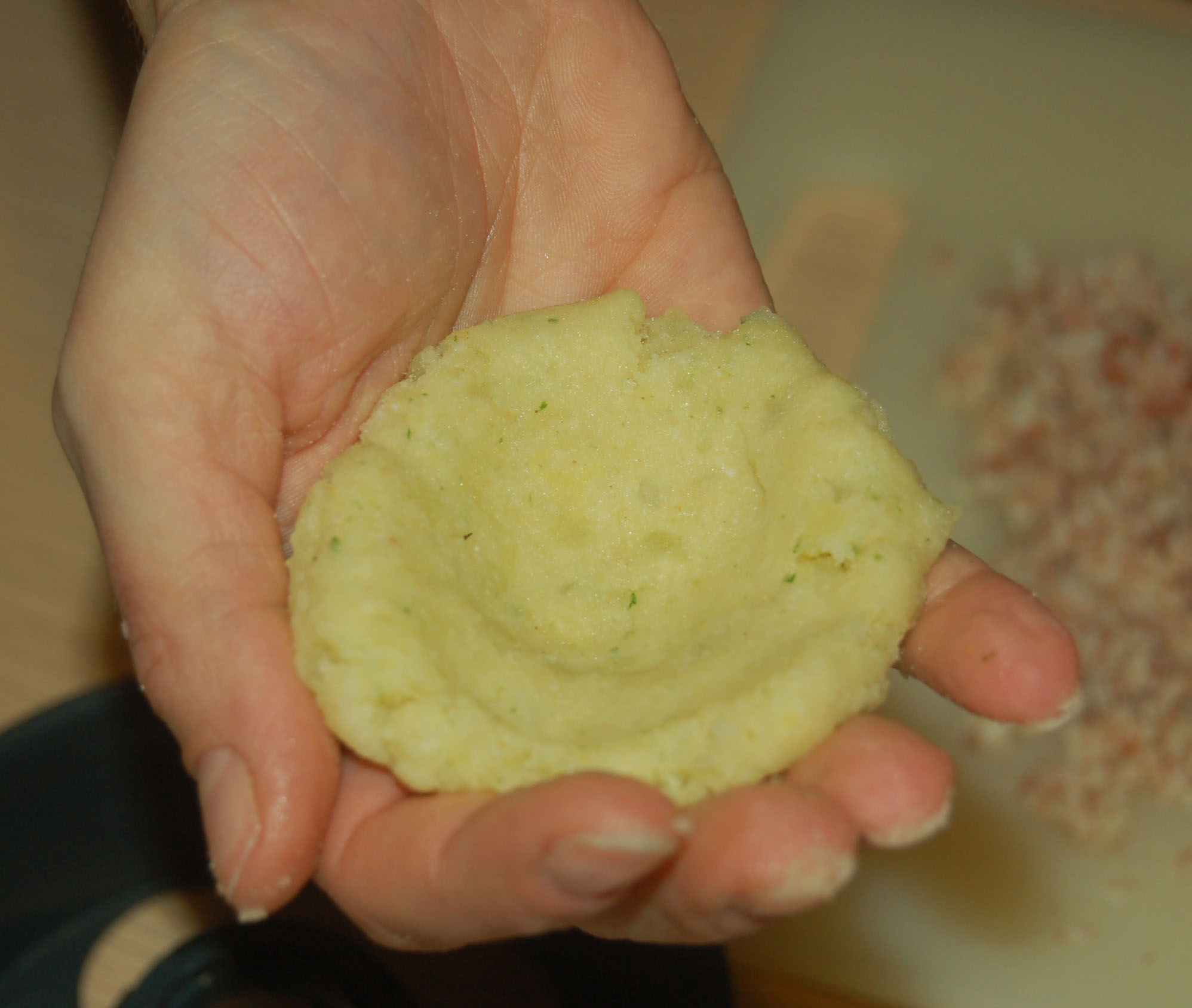 composto con le mani fino a renderlo omogeneo.Prendere un po’ di impasto, allargarlo e scavarlo un po’ e farcirlo con