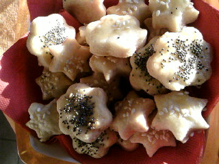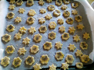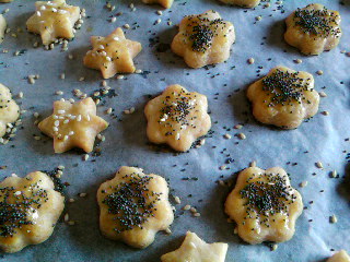 Stendere l'impasto su una spianatoia creando una sfoglia di circa mezzo cm di spessore. Con degli stampini per biscotti creare le forme (io ho usato degli stampini molto piccoli). Spennellare con il tuorlo d'uovo e spolverare di semi di sesamo o di papavero.