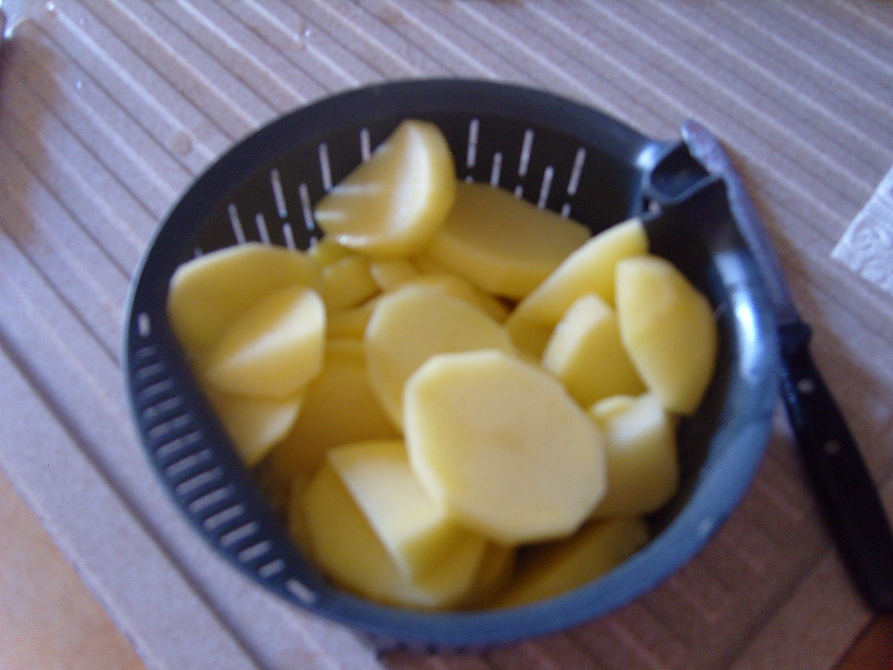 Lavare e pelare le patate; tagliarle a rondelle e mettere da parte.