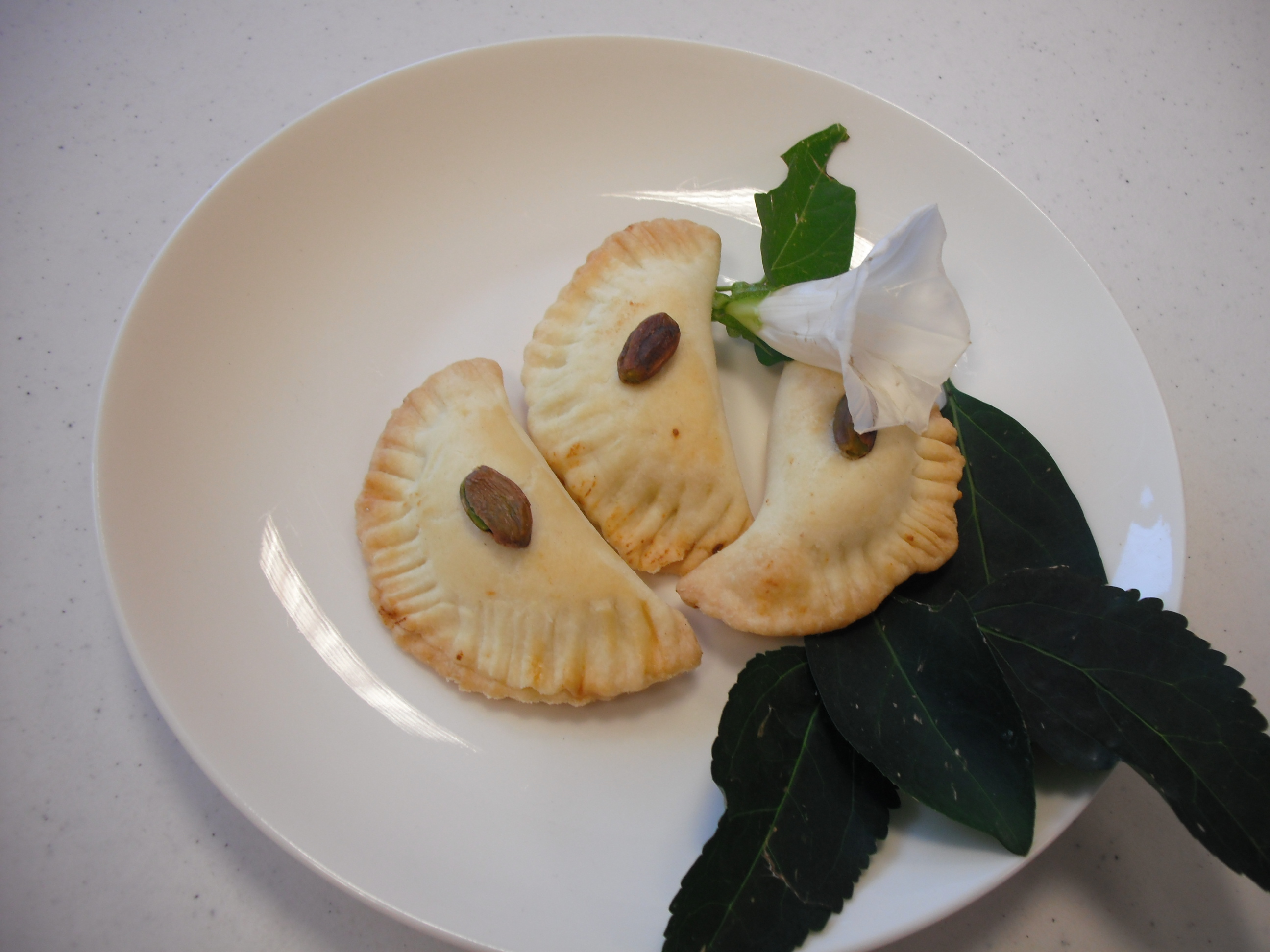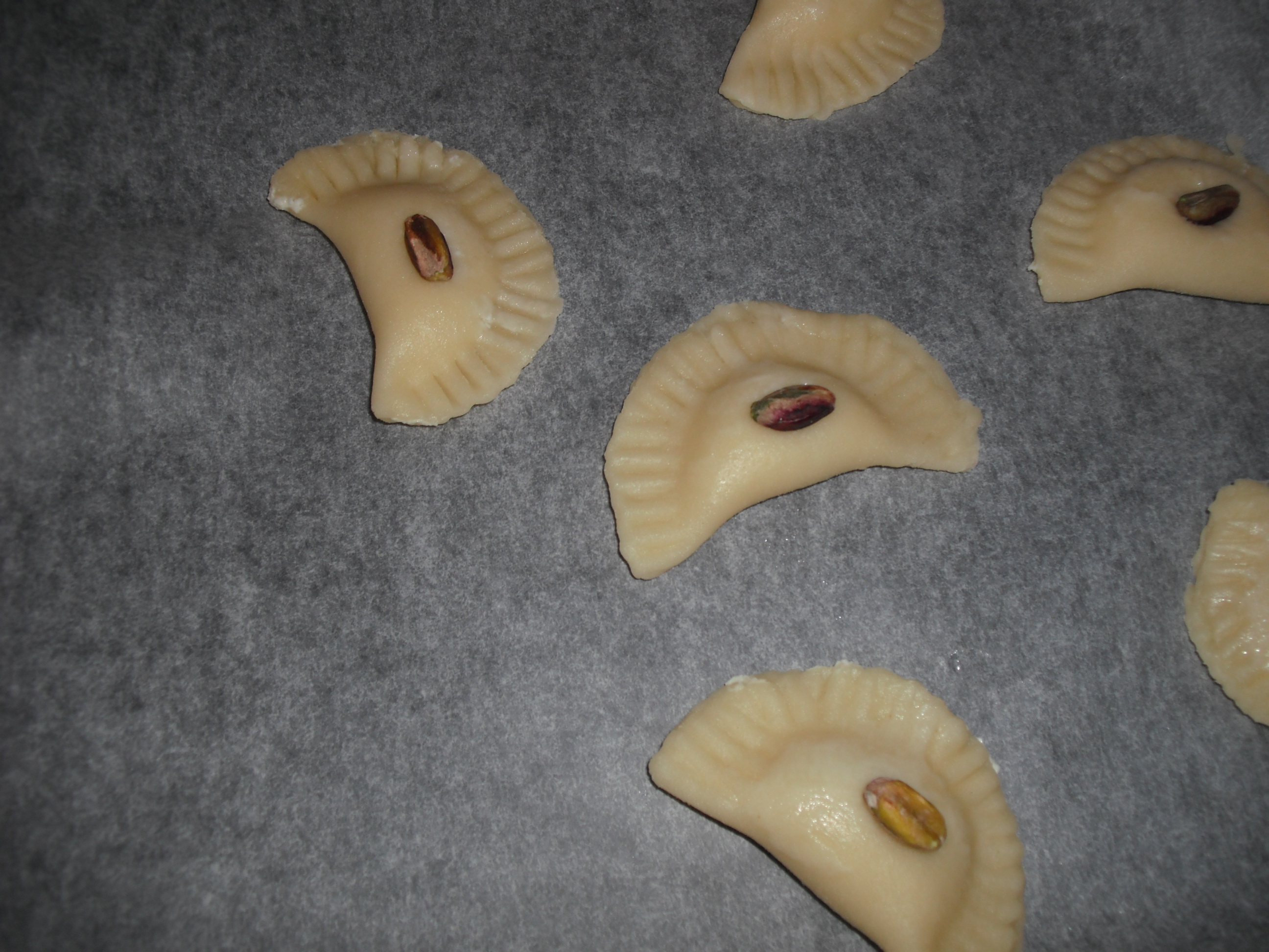 11. Su ogni mezzaluna posizionare un pistacchio diviso a metà.