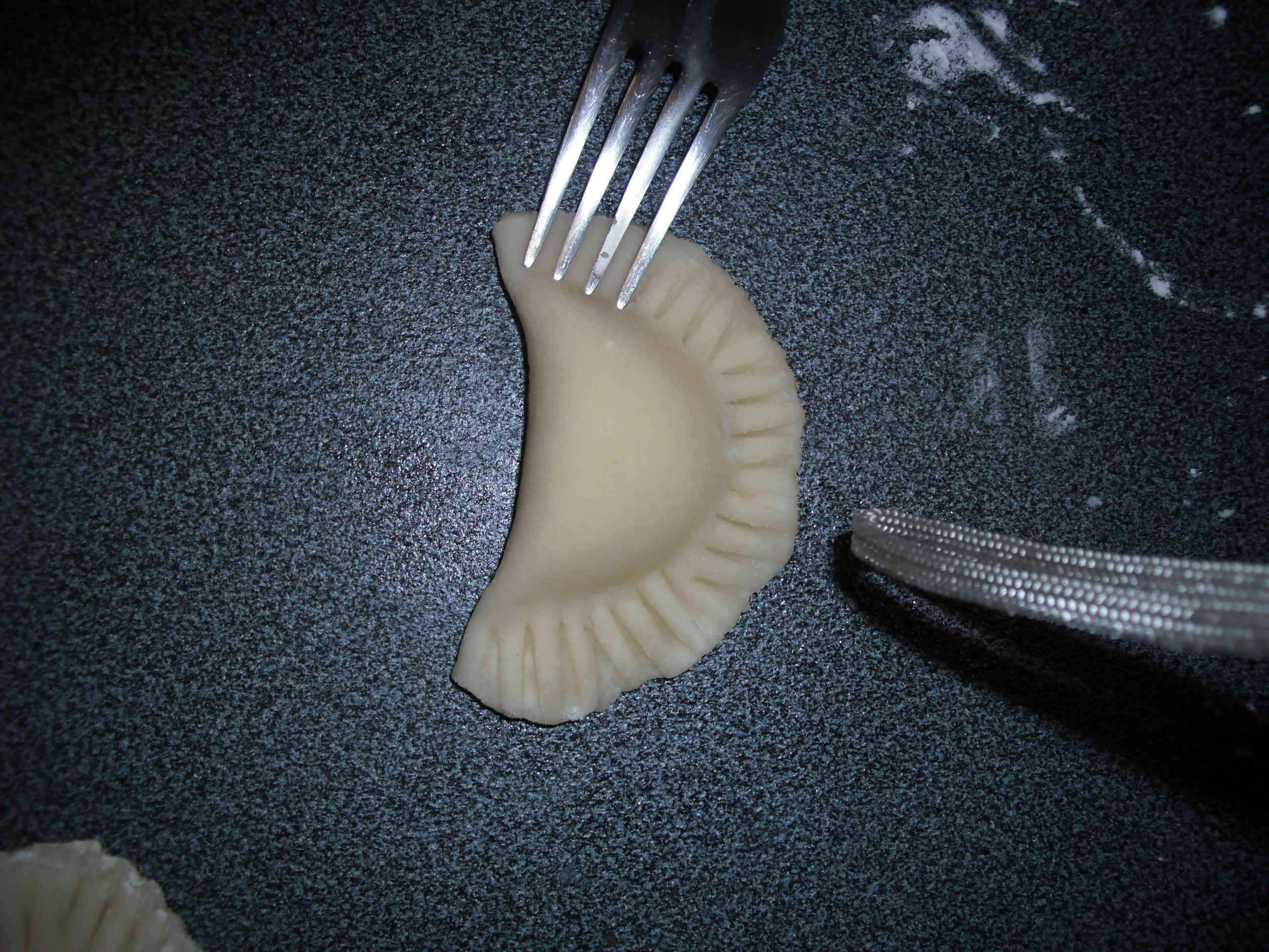 9. Farcire i dischi con la crema e chiuderli a mezzaluna, prima con le dita e poi aiutandosi con una forchetta.