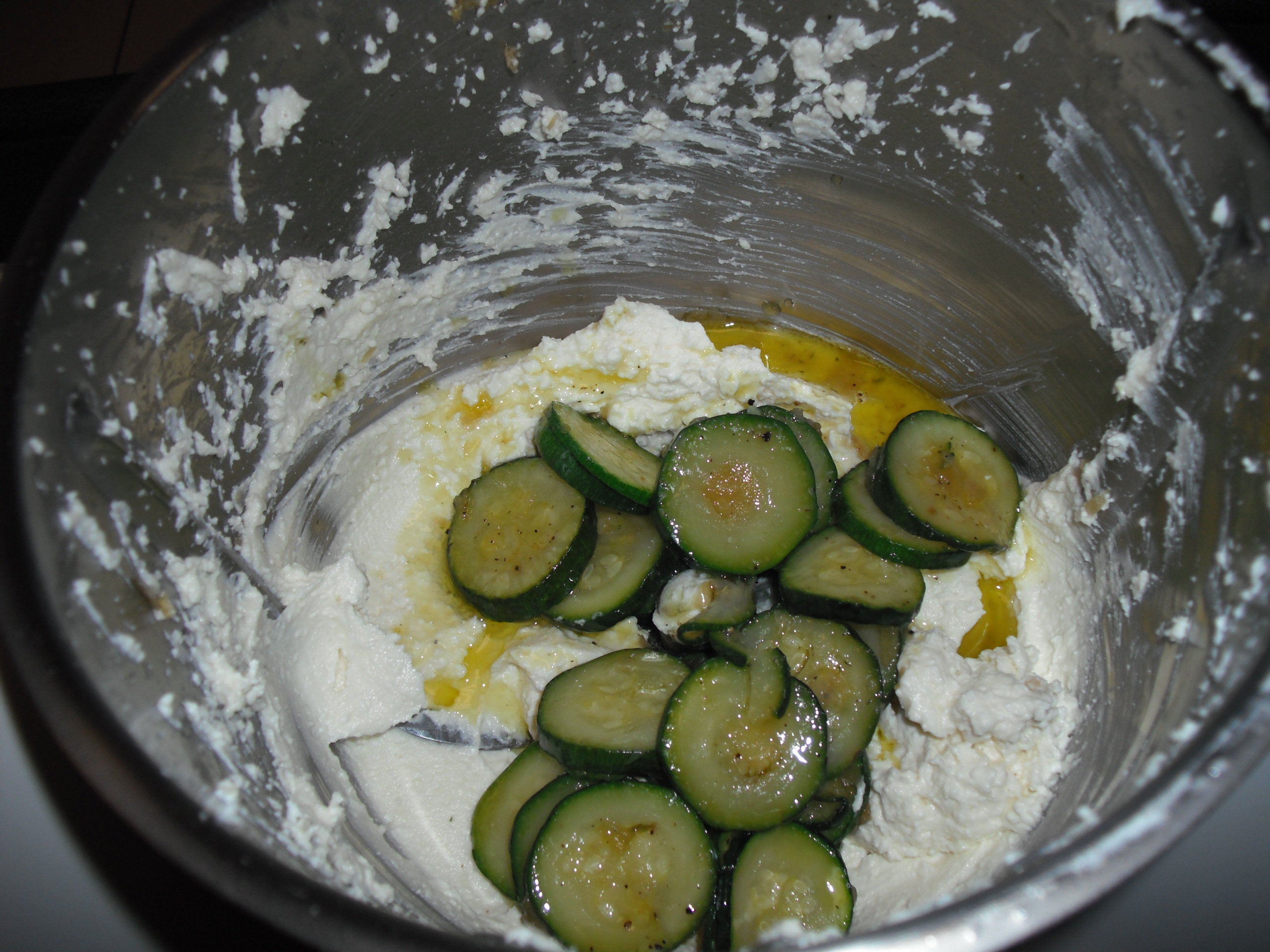6. Levare la zucchina, e senza lavare il boccale, versare il quartirolo tagliato a tocchi, la ricotta, l'uovo e frullare: 20 sec./vel. 5.