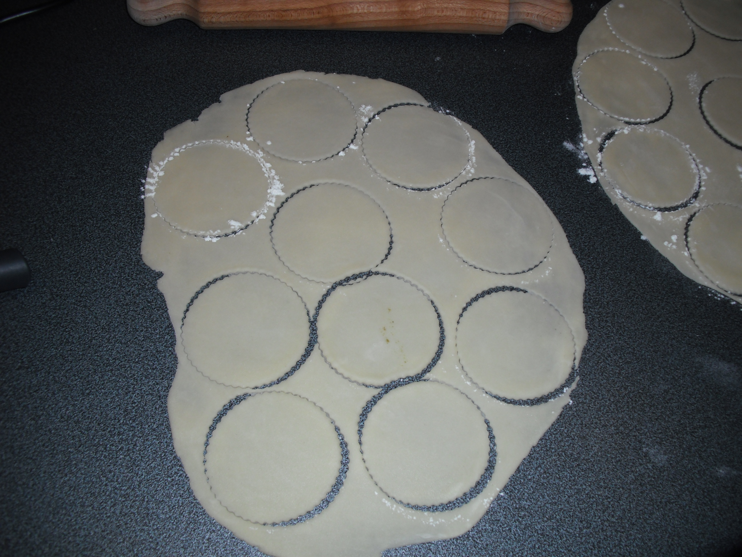 8. Stendere la pasta brisé su un piano infarinato e ricavare con un coppa pasta dei dischi di circa 8 cm. di Ø.