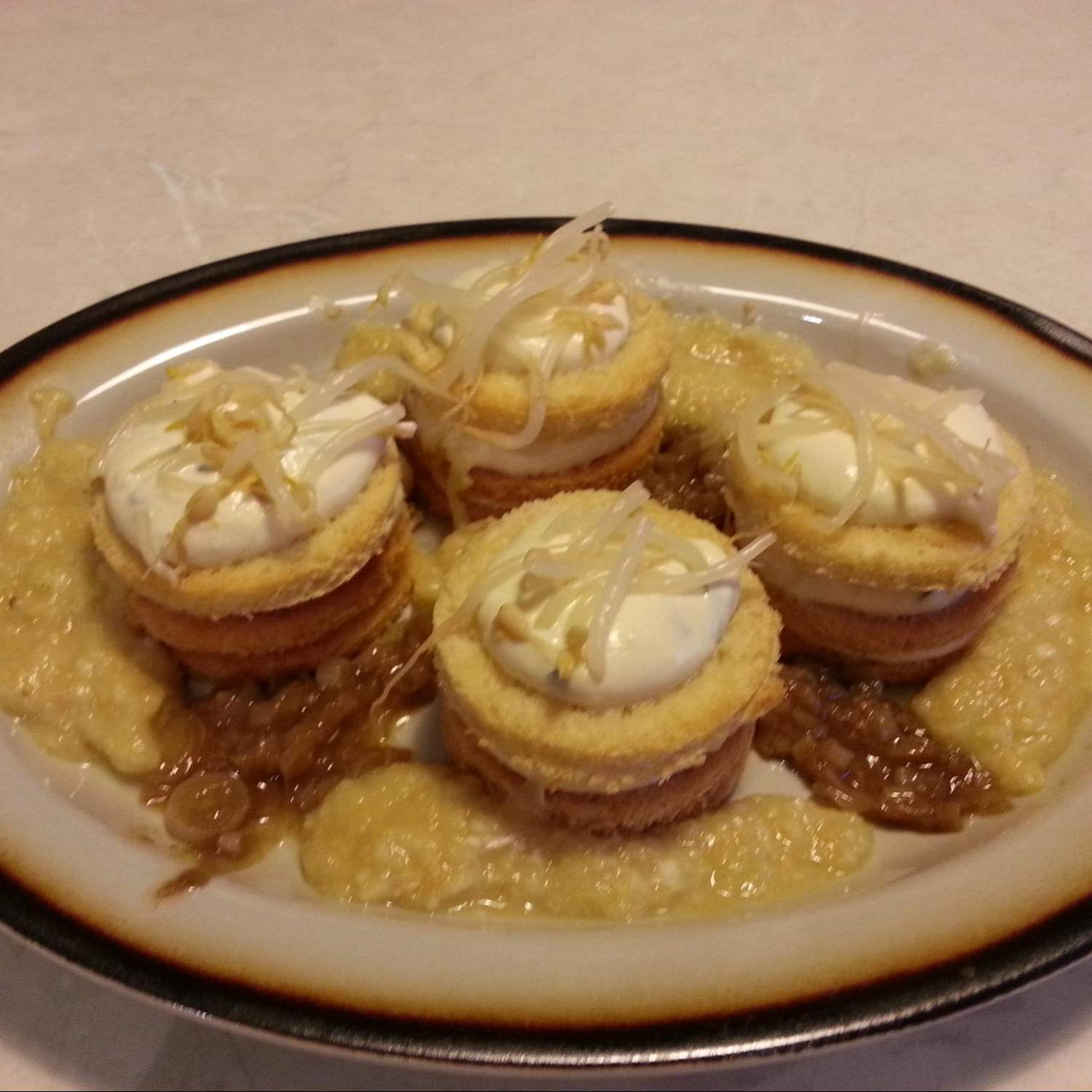 Assemblare ora i mini sandwich distribuendo la ricotta sui dischetti di pancarré facendo 3 strati. Servire su un piatto da portata, guarnendo con i germogli di soia (o a gusto con ciuffi di carote o zucchine tagliate a julienne) e accompagnando con la salsa di ceci e i cipollotti stufati.