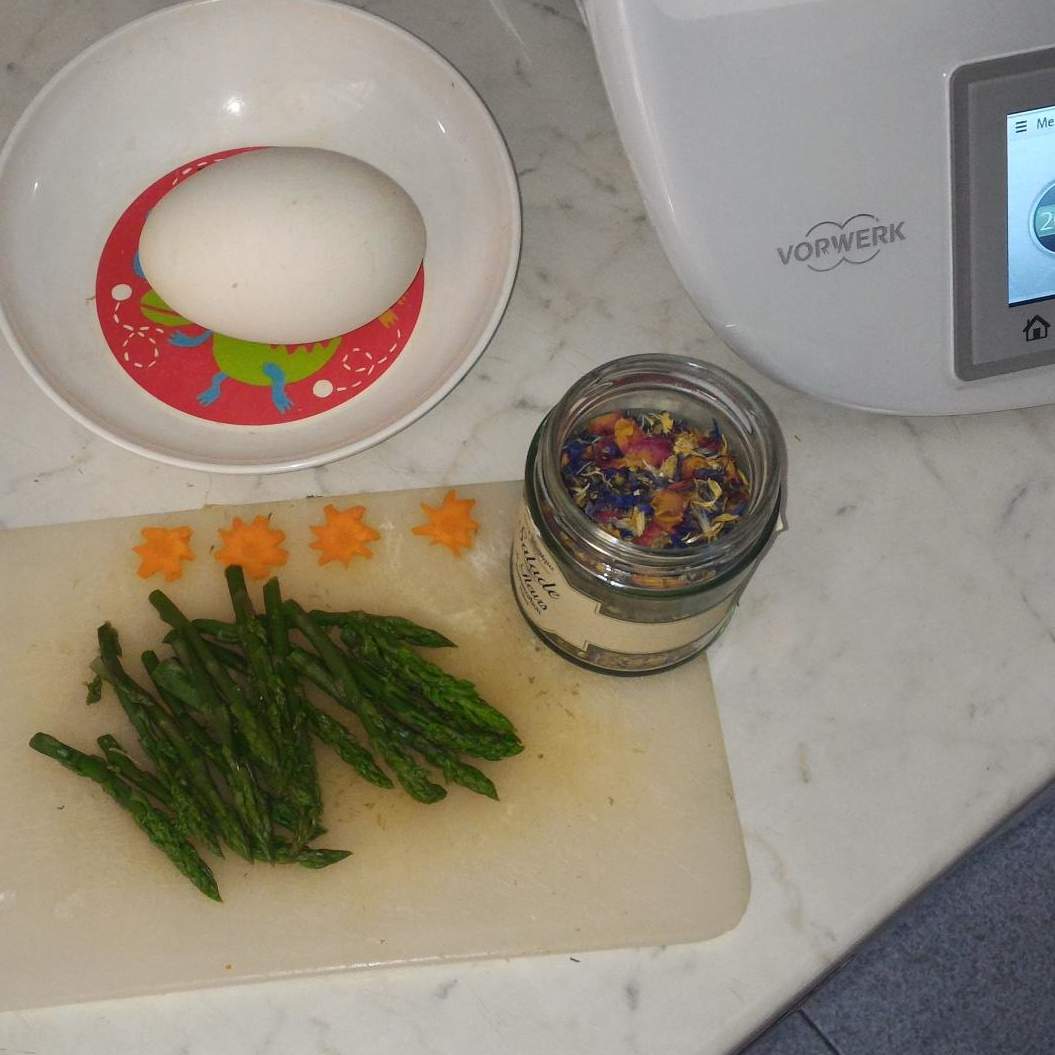 3. Aggiungere i fiori edibili e le punte di asparagina, mescolare bene.