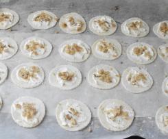 "coperchio chiuso" le noci 5 sec vel 5; - Disporre su ogni dischetto del gorgonzola o robiola e ricotta spalmati, alcuni semi di finocchio e le noci tritate;