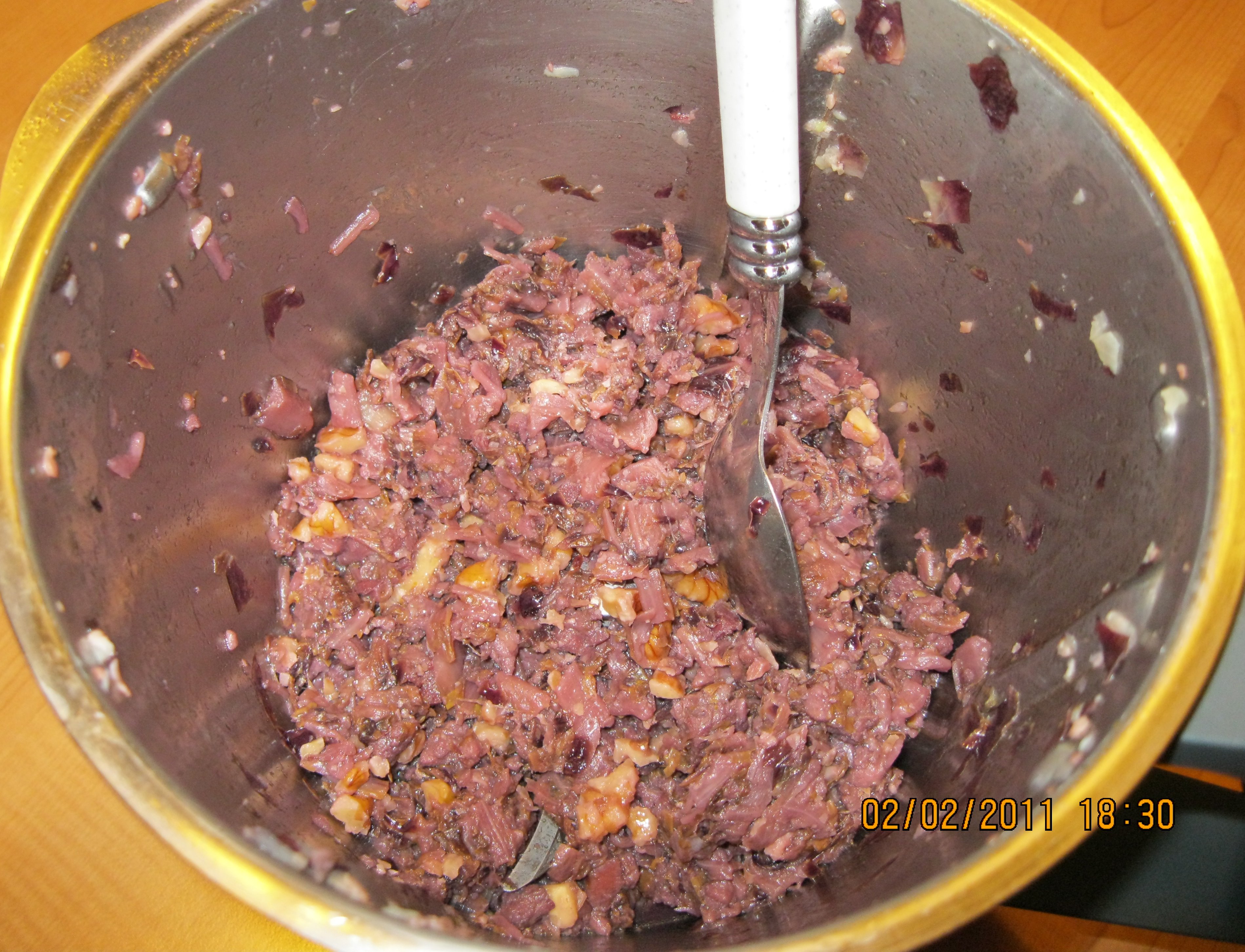 "coperchio chiuso" la cipolla 5sec vel 7, poi l'olio e stufare per 3m 100°vel 1. Poi il radicchio e il sale cuocere 10m a varoma , sfumando con il vino. Se si dovesse formare l'acqua scolarla e mettere in una ciotola aggiungendo lo speck.e le noci tritate. Nel