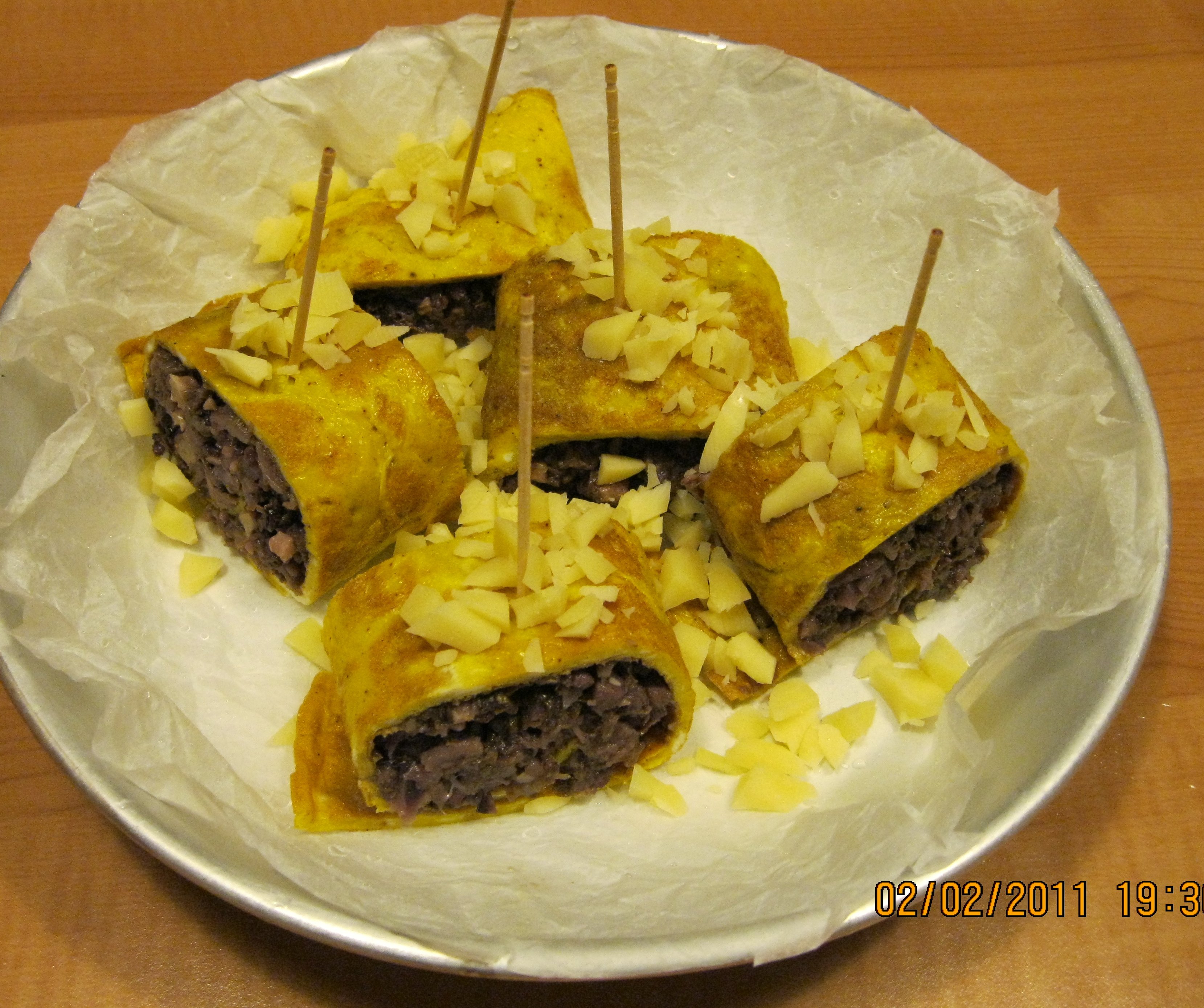 "coperchio chiuso" inserire le uova ,il sale e il pepe 10sec vel 5. Cuocete 2 frittate in una padella antiaderente di cm 24, sistematele su carta da forno e stendete il radicchio e lo speck su ognuna, arrotolatele e formate un cilindro aiutandovi con la carta da forno. Fate raffreddare e tagliare il cilindro in piccoli tranci e fissate con uno stecchino. Sistemarli su una teglia foderata con carta da forno spolverizzate con l'asiago tritato e infornate a 180° in forno caldo per 10/15m circa.