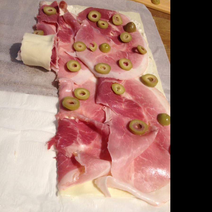 Coprire con fette di prosciutto e cospargere con le olive verdi denocciolate e tagliate a fettine.