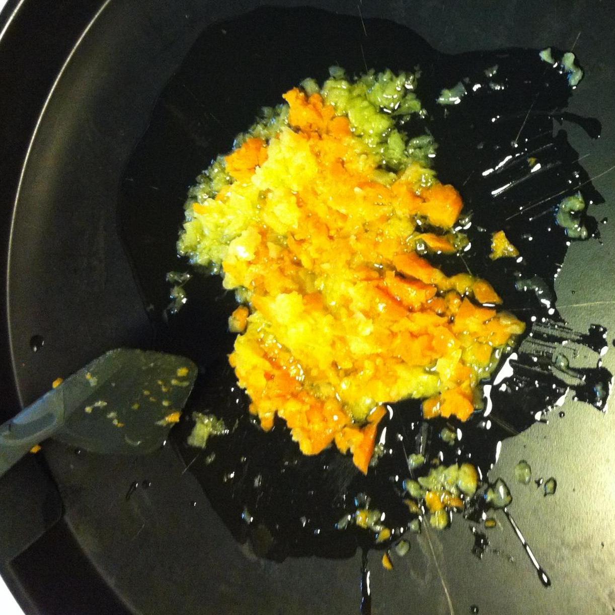 "coperchio chiuso" la cipolla (mezza) e i tre pezzi di carota lessata, 3 sec. vel. 7, riunire sul fondo con la spatola e poi soffriggere 3 min. 100° vel. 1Versare il soffritto in una teglia da forno (la mia indicativamente è di 35 cm. di diametro).