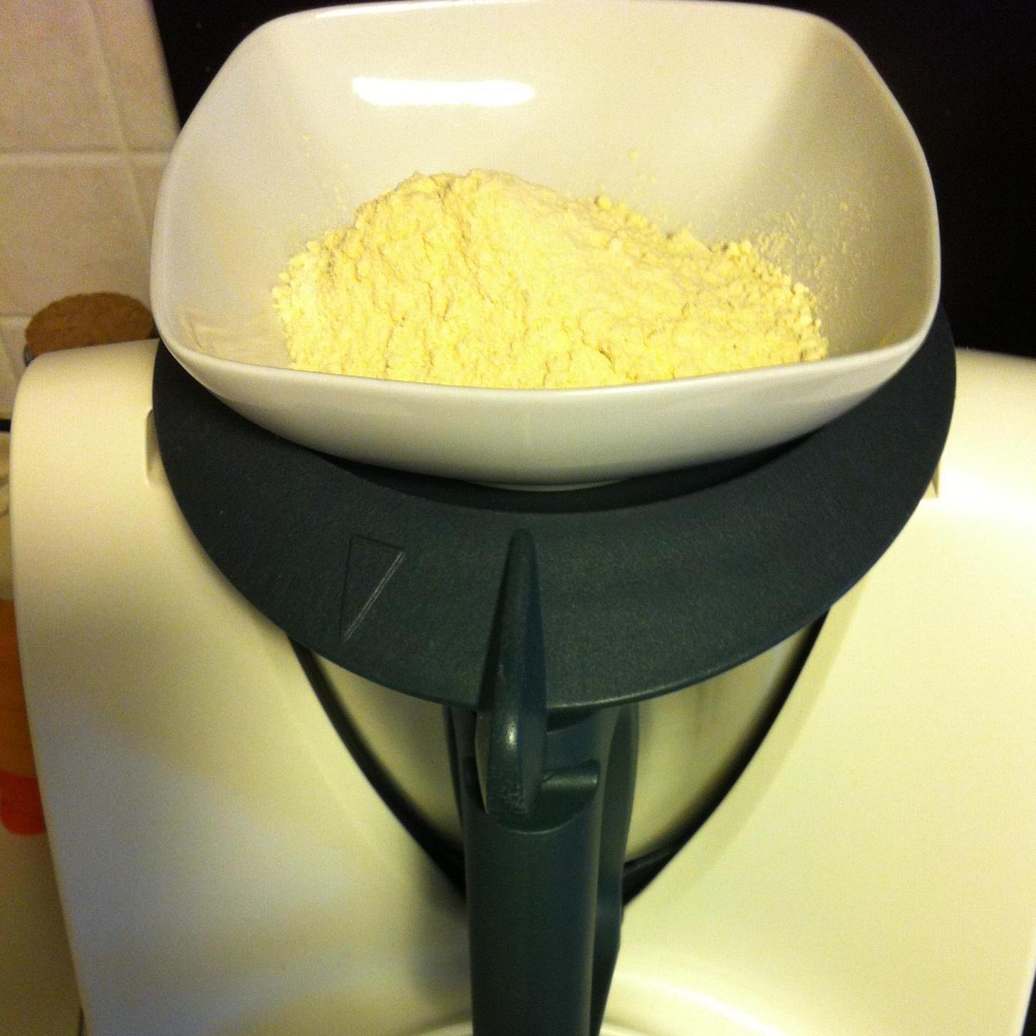 "coperchio chiuso" versare 300 g del liquido precedentemente tenuto da parte, un pizzicotto di sale ed avviare a velocità 4 senza misurino.Inserire dal foro del coperchio la farina e mescolare per un minuto.