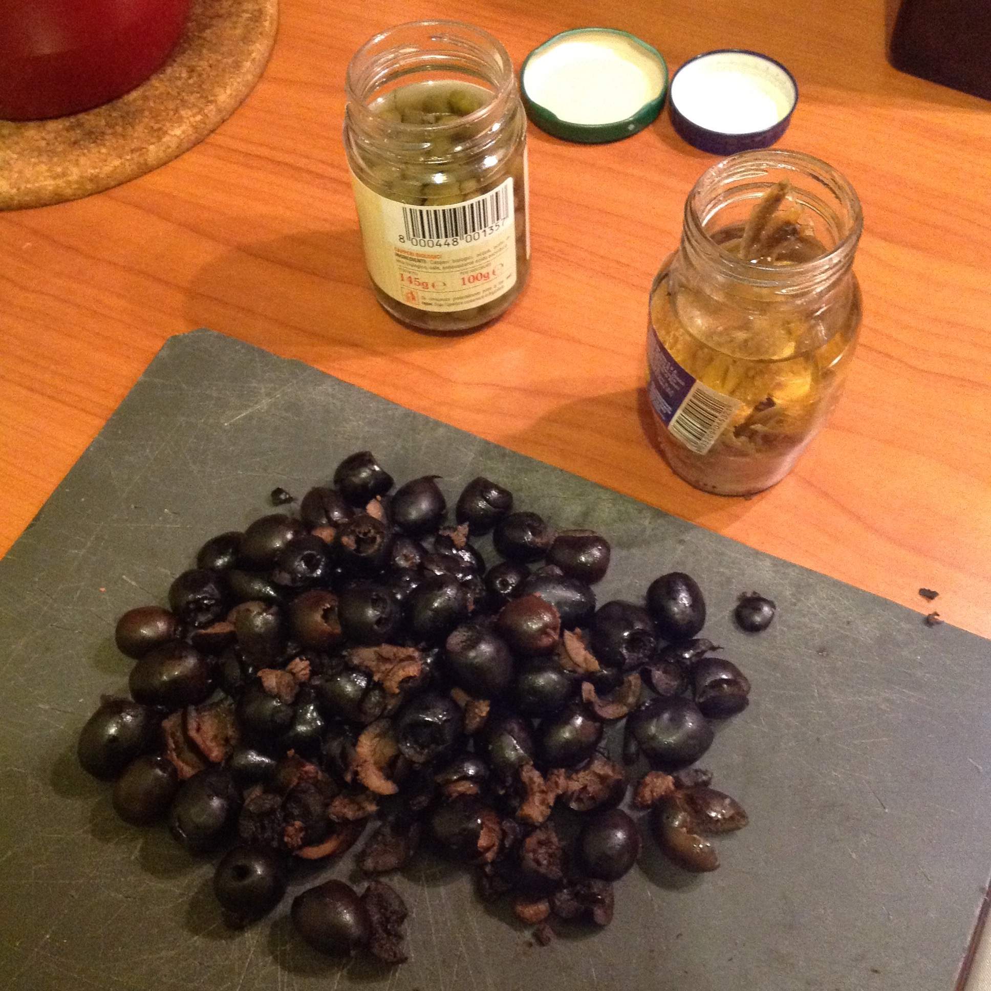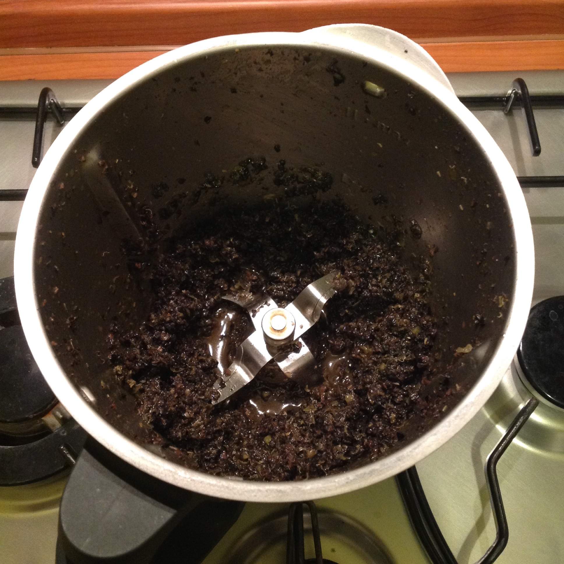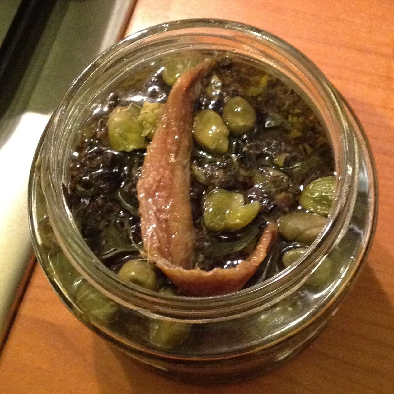 Versare in un barattolo basso e largo, aggiungere per decoazione qulche cappero ed un'alice.