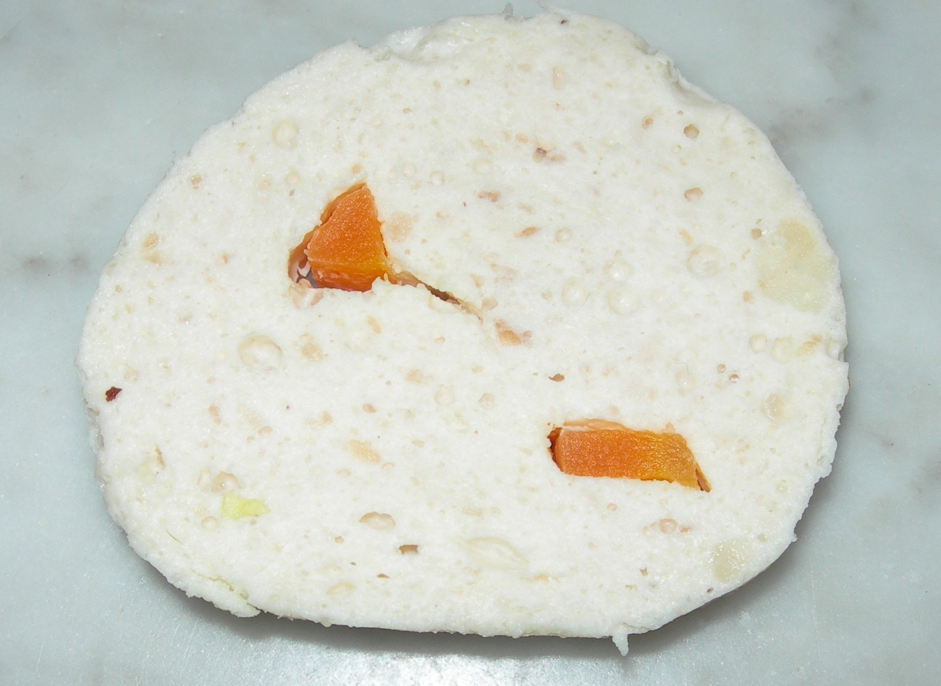 - Al centro di esso disporre ordinati il bastoncino di carota, i piselli e i pistacchi, completare con il restante impasto di pollo, e formare un salamotto, avvolgerlo prima nella carta da forno e poi nel foglio di alluminio;