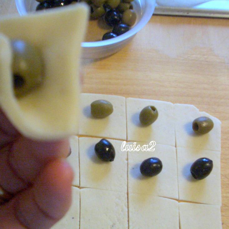 Stendere l'impasto sottile e tagliarlo a quadrotti, in ogni quadrotto inserire un’oliva e richidere la pasta come un fagottino, appoggiarle sulla teglia da forno coperta da carta forno, cuocere nel forno già caldo 180° per circa 15 – 20 min