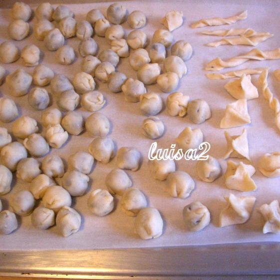 stendere la pasta molto sottile, tagliarla a quadrati di circa 4 cm per lato, mettere al centro un'oliva e chiuderla all'interno