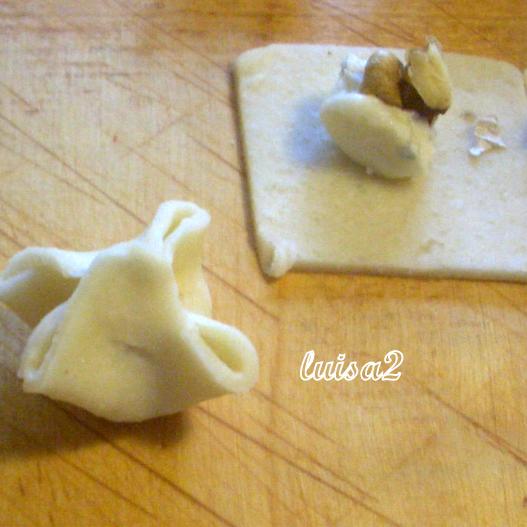 questa è una prova, un pochino di gorgonzola e un pezzettino di noce, chiuso a fagottino (bisogna bagnare il bordo con un pò di acqua o tuorlo d'uovo per sigillare bene)