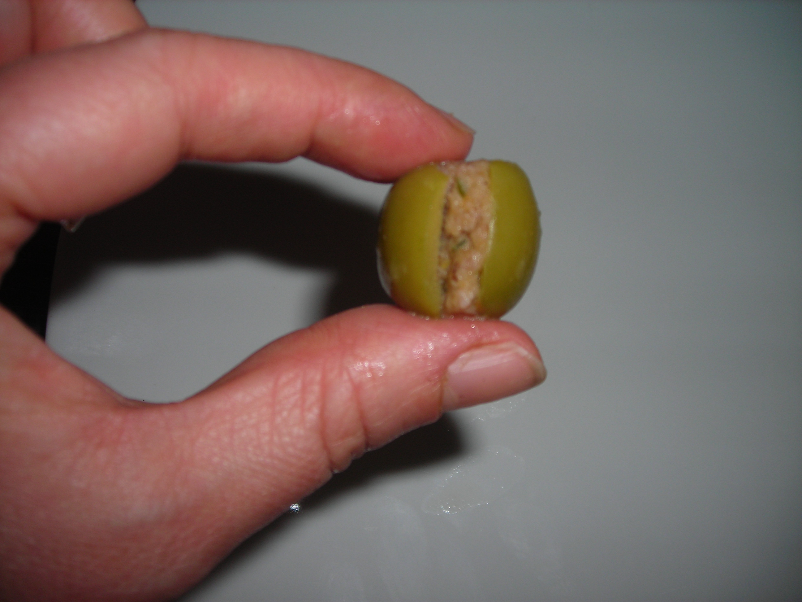 - Tagliare con la punta del coltello un lato di oliva e mettere dentro il ripieno.