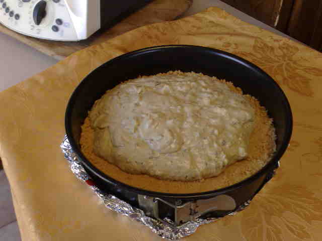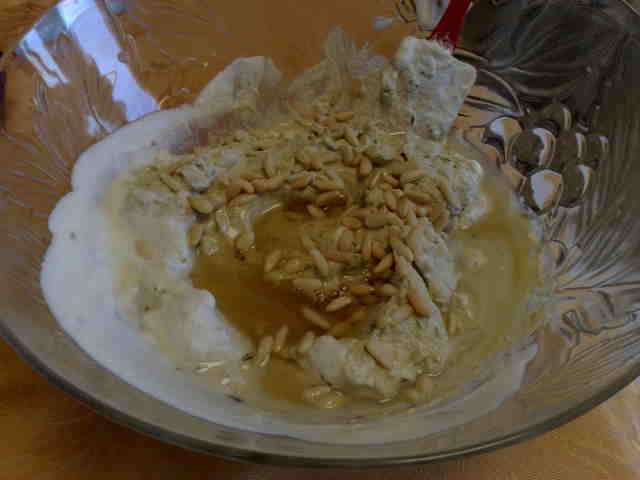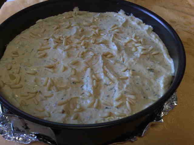"antiorario" mantecare per 2 secondi vel 3 i pinoli non devono spezzarsi è piacevole trovarli interi dentro la torta salata. mettere tutto in una ciotola e unire la panna montata ( lo faccio fuori dal boccale per non sgonfiarla .. assaggiare.. unire il pepe... ma prima di unire il sale assaggiare (io non ho usato sale.). il tutto era molto saporito... Con questa farcia squisita farcire il fondo della torta che abbiamo messo in frigo.. abbellire con i pinoli e con foglioline piccole di basilico .Dopo (2 ore anche più) si può gustare è SPECIALE e soprattutto adatta per l'estate perchè NON SI USA IL FORNO....