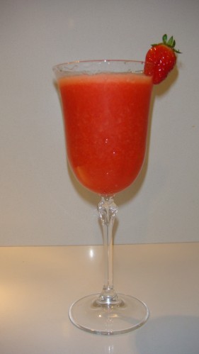 Versare nei bicchieri e decorare con una fragola.
