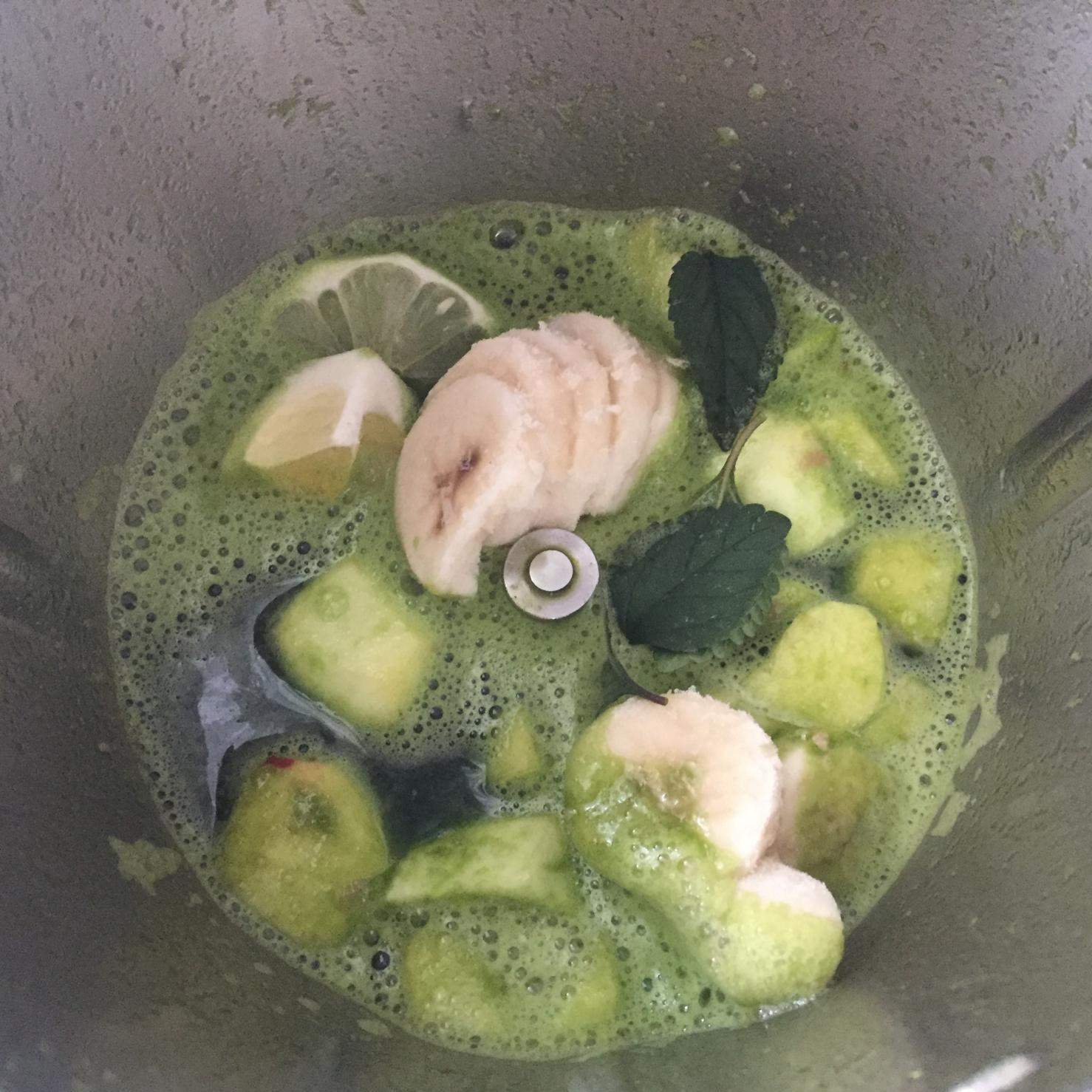 "coperchio chiuso" e mettere le foglie di cicoria e bietole e l'acqua, mettere il coperchio e il misurino e frullare 1 minuto vel 10; - Aggiungere la banana, il limone, lo zenzero, la crema di mandorle, la mela tagliata in 4 parti e le foglie di Lippa Dulcis, chiudere il coperchio e mettere il misurino e frullare 1 minuto vel. 10;
