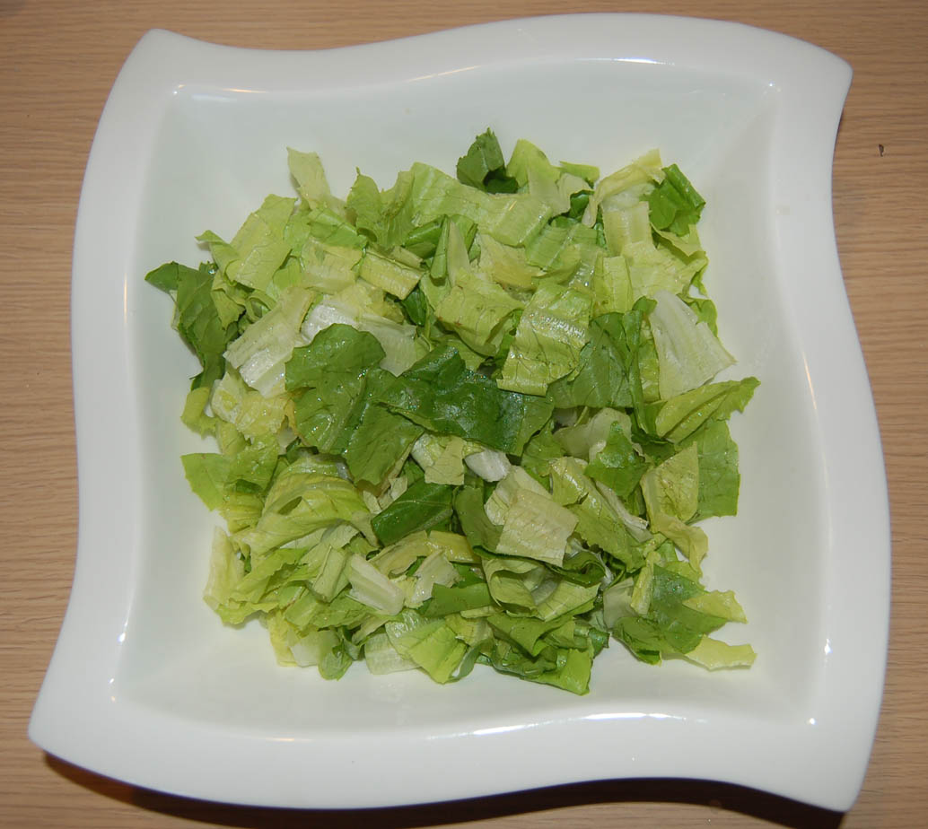- Tagliare l'nsalata, dopo averla ben lavata e asciugata, e disporla sul piatto di portata;