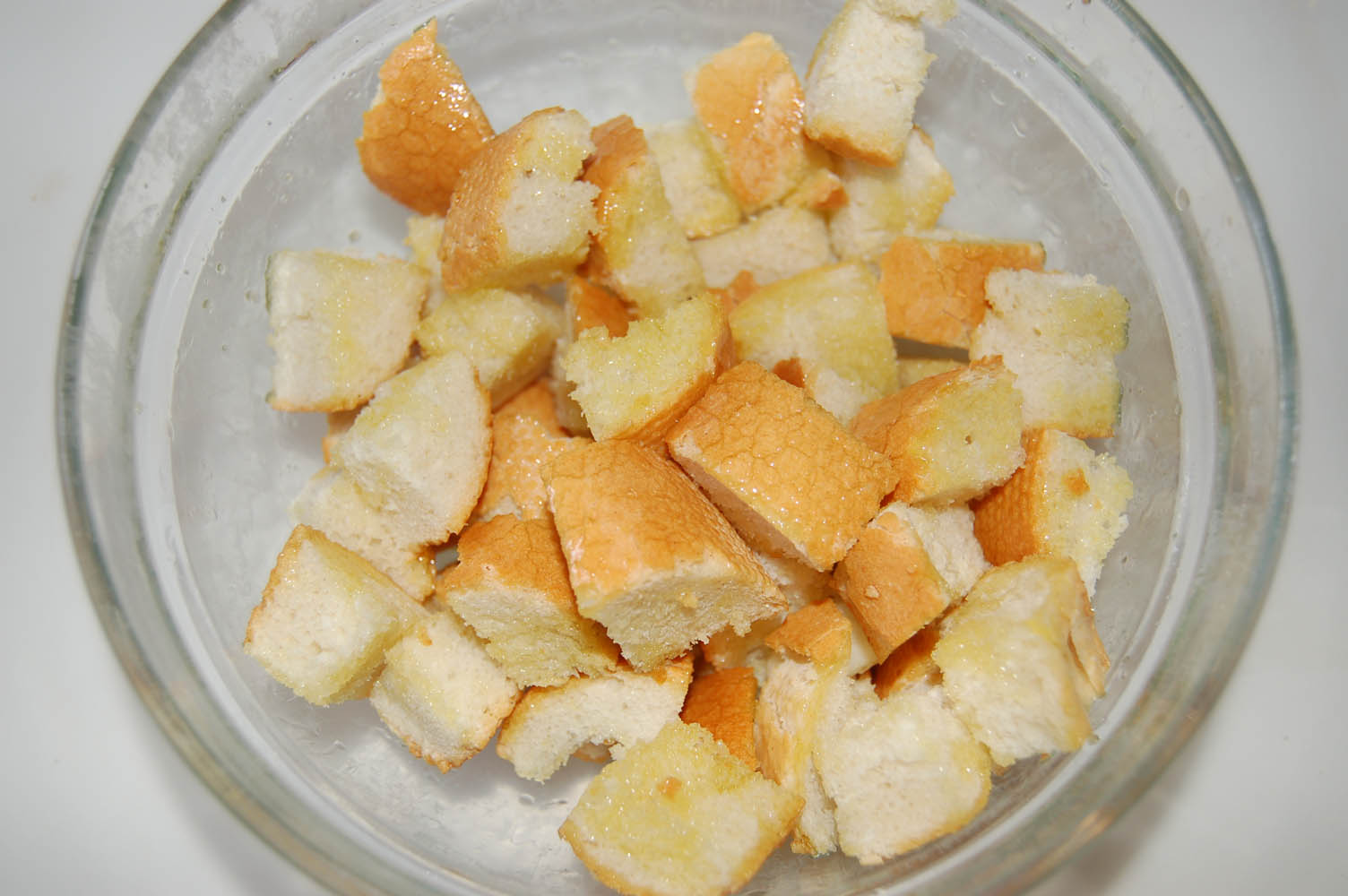 - Tagliare la baguette a cubotti di 1 cm abbondante, metterli in una ciotola e versarvi i 3 cucchiai di olio, lo spicchio d'aglio schiacciato con il dorso del coltello e una pizzicata di sale, mescolare ad amalgamare bene il tutto;