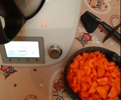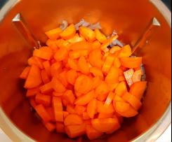 - Aggiungere nel boccale le carote, 2 misurini di acqua, un cucchiaio grande di dado Bimby, un cucchiaino di sale, prezzemolo tritato, pepe a piacere. Cuocere per 20-25 minuti/Varoma/