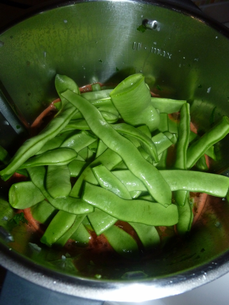 5. Mettere 700 gr. di fagiolini nel boccale con il pomodoro, ed i restanti 300 gr. nel Varoma (io ho fatto così per averne un po' da condire solo con olio limone e menta): varoma, 30 min. antiorario vel.2;