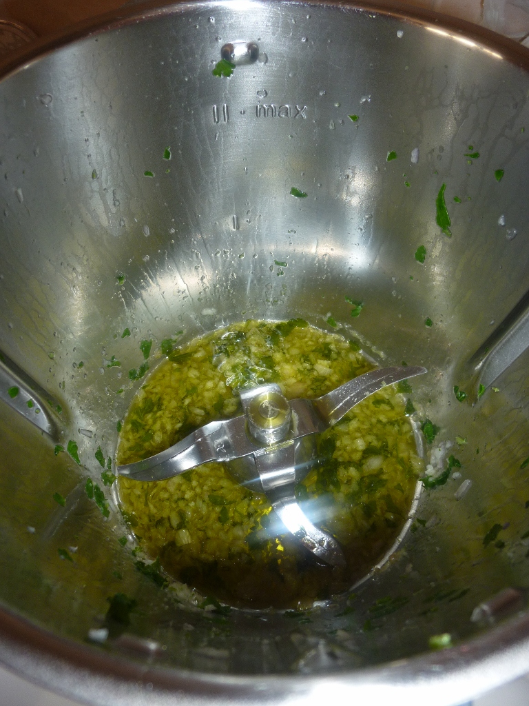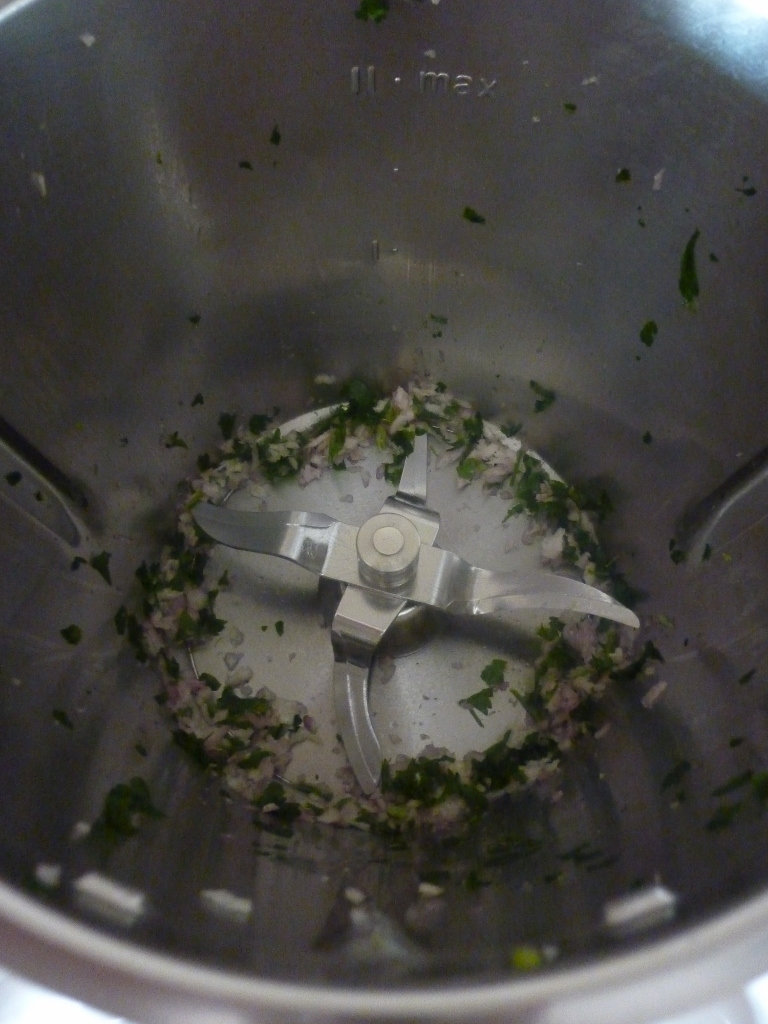 2. Nel frattempo, a vel.7 dall'alto versare prezzemolo e scalogno e tritare 5 secondi;