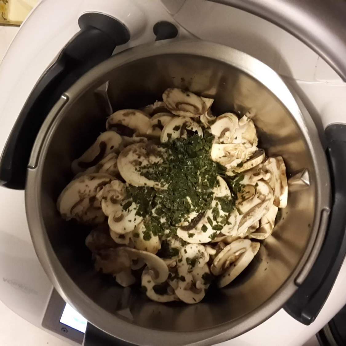3. Aggiungere i funghi, il sale, il pepe e il prezzemolo e cuocere per 10 min 100° vel 0,5