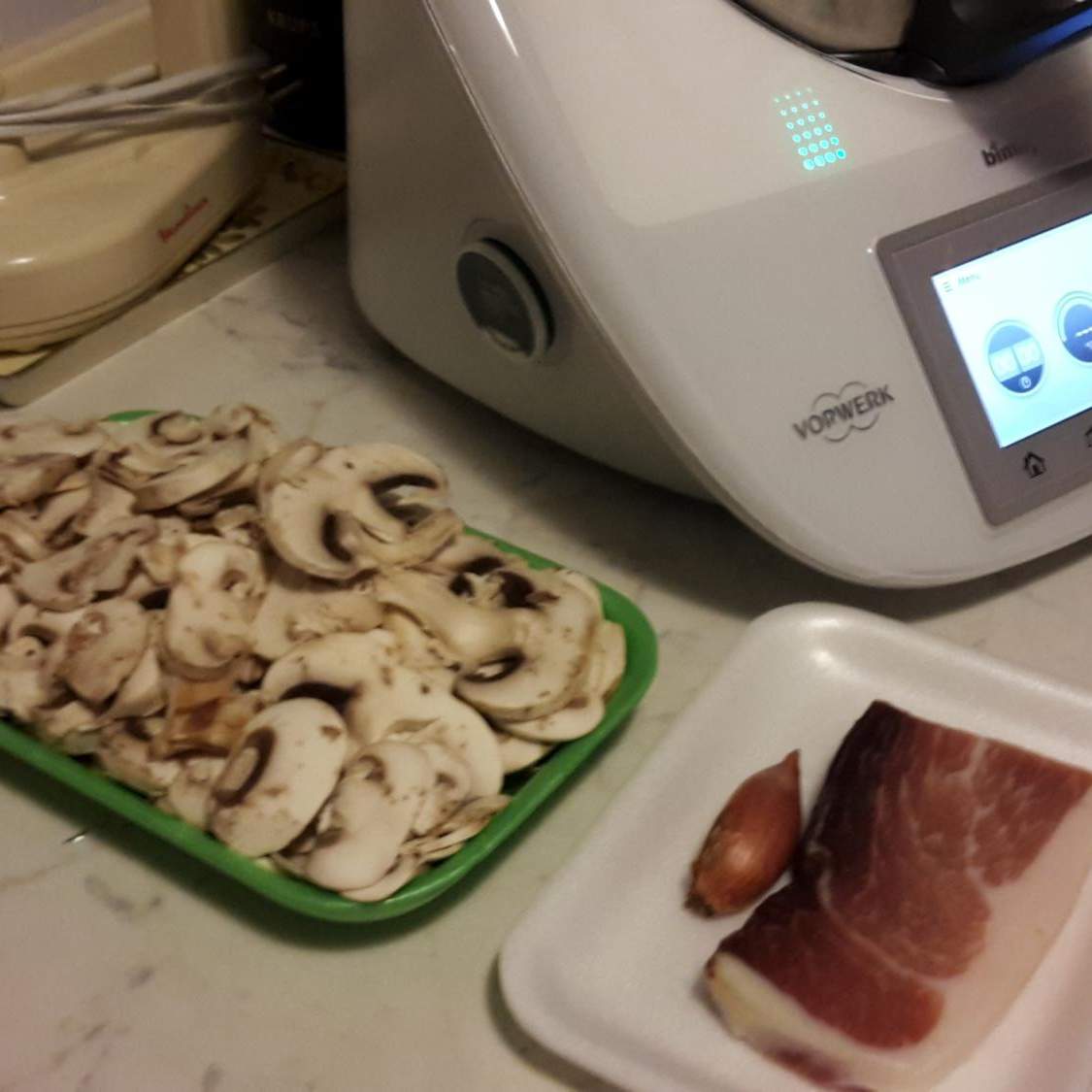 1. Gli ingredienti. Tagliare a fettine gli champignon e lo speck a listarelle.