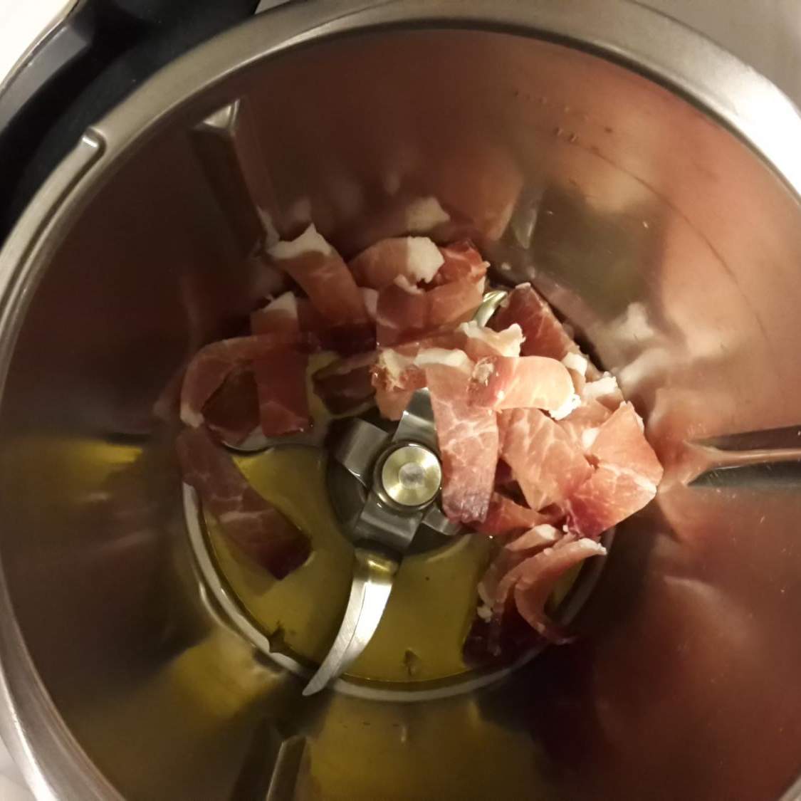 "coperchio chiuso" e tritare per 5 sec vel 5, riunire sul fondo con la spatola. Aggiungere l'olio e lo speck tagliato a listarelle e rosolare per 3 min 120° vel 1.