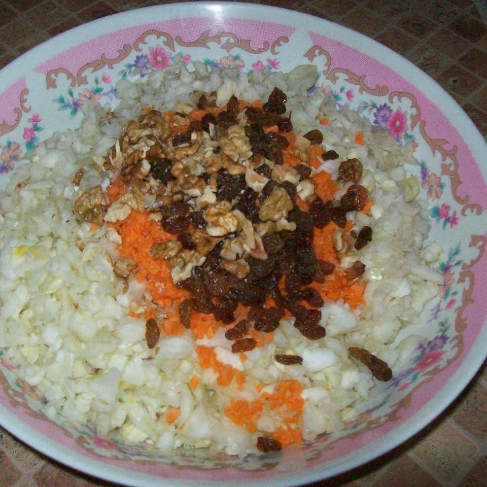 "coperchio chiuso" mettere le carote, pulite, a pezzi: 3-4sec / vel 5. Mettere all'altre verdure. Aggiungere l'uvetta, le noci, spezzate con le mani, il sale, il pepe, lo zucchero , l'olio, ed il succo di limone q.b. Girare bene il tutto.