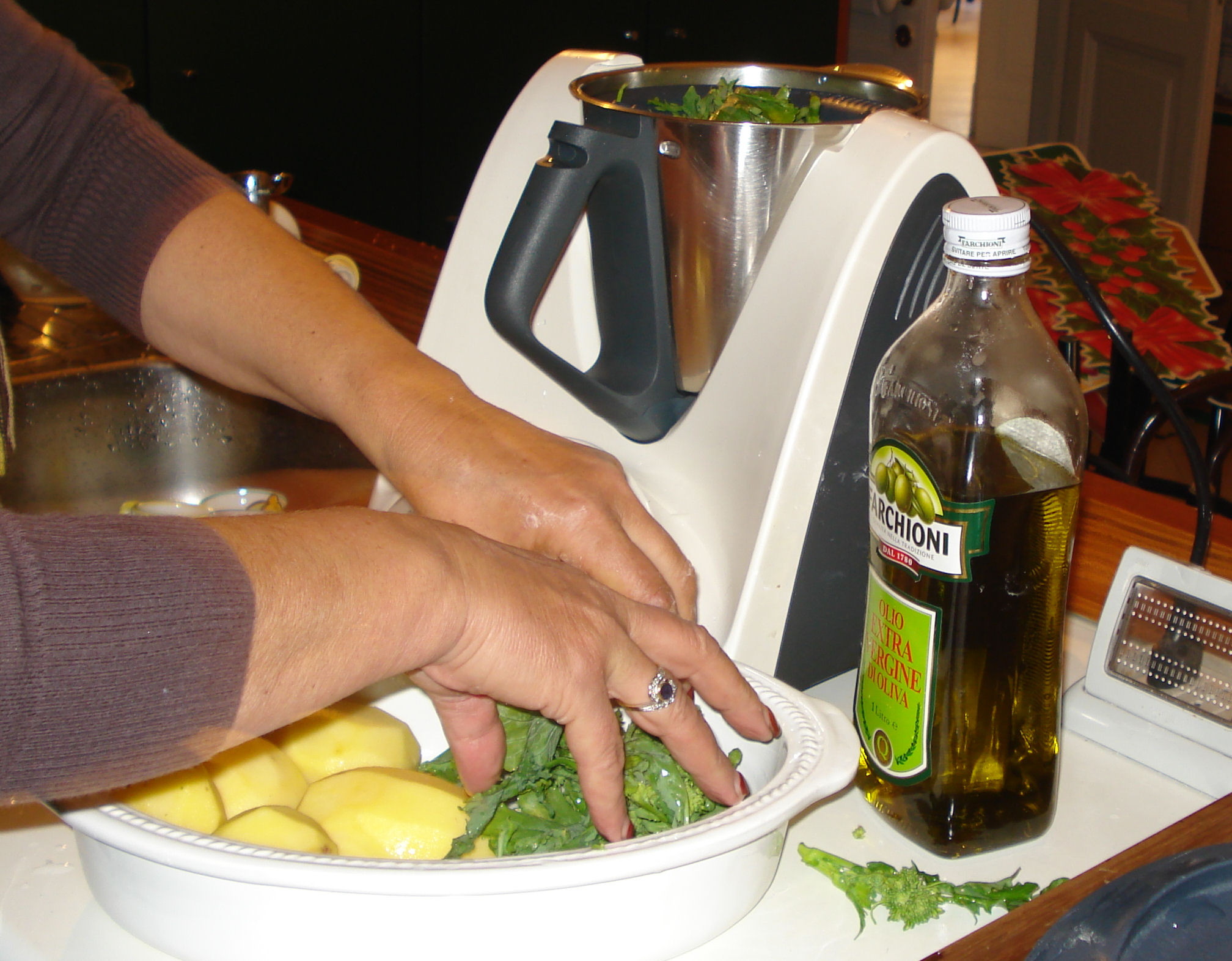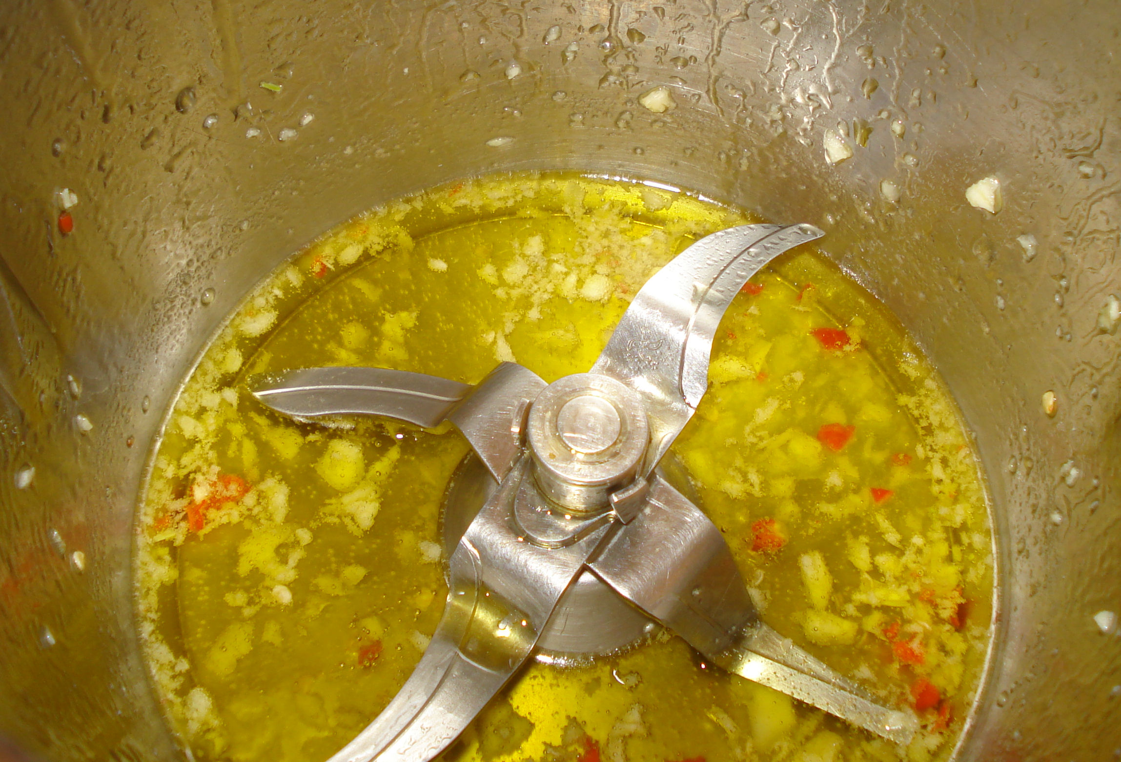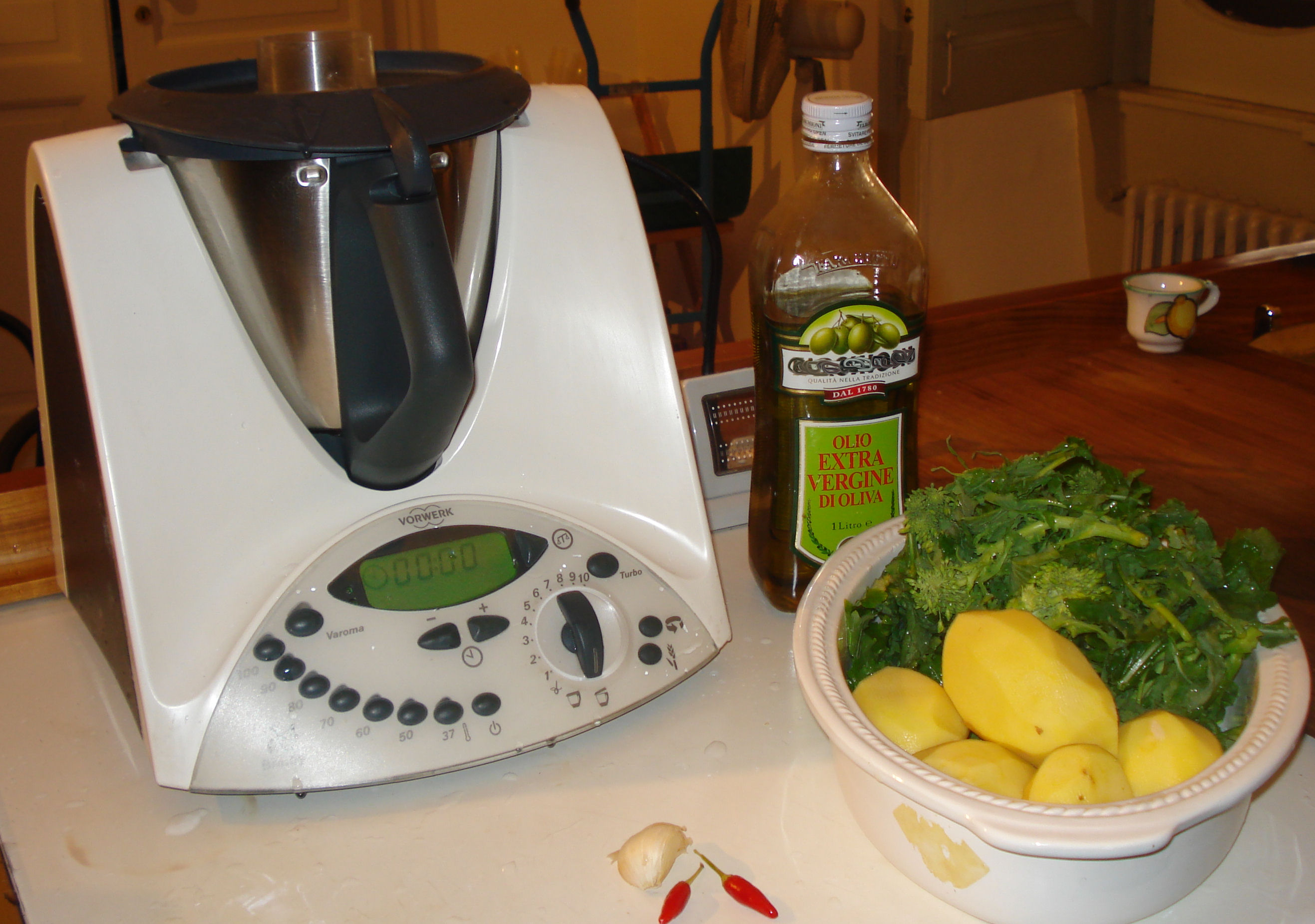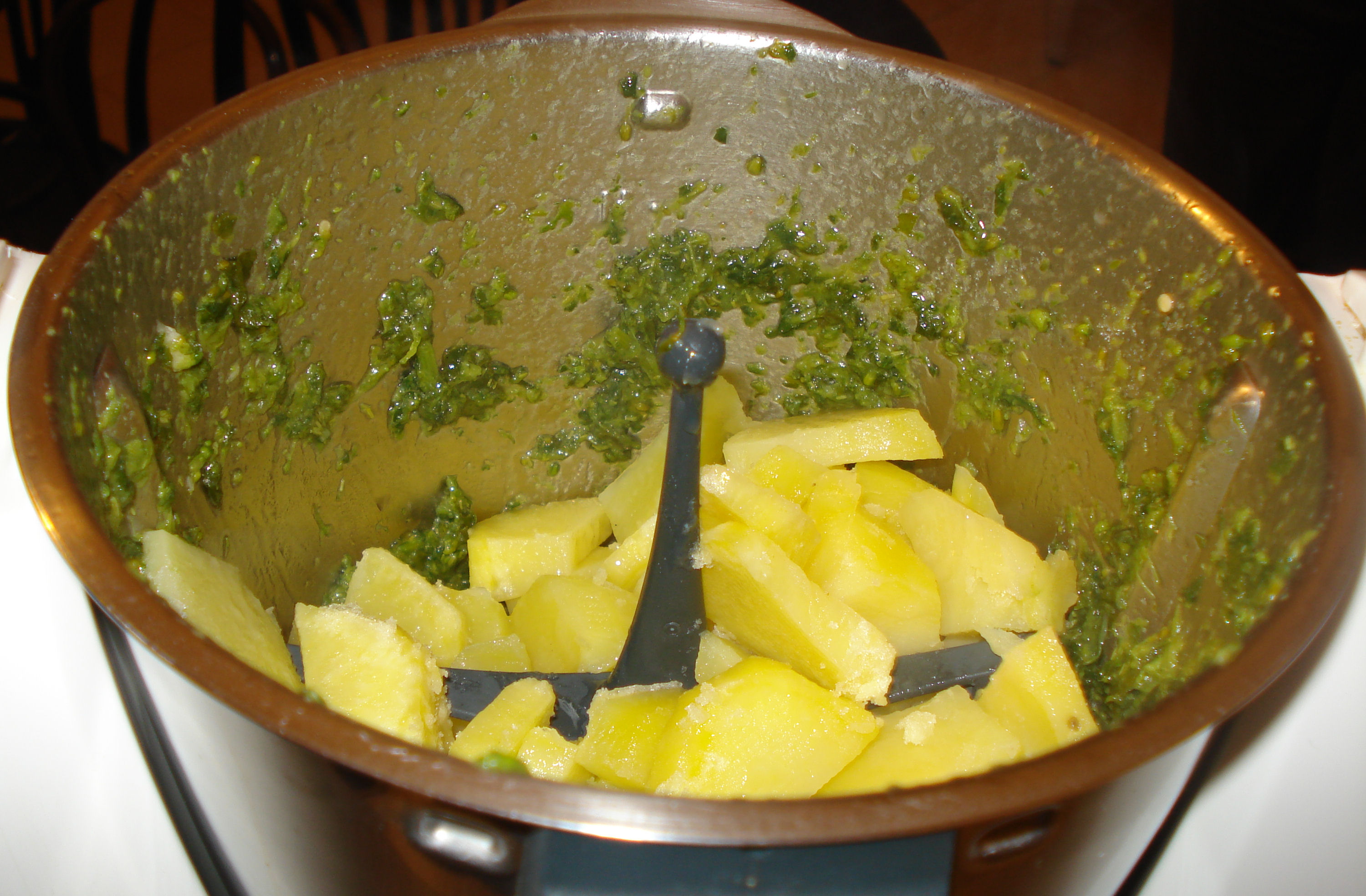 3. Mettere da parte le patate e le cime di rapa cotte, ripulire il boccale, asciugarlo con cura e inserirvi l'aglio e il peperoncino, tritare: 5 sec./vel. 7. Riunire sul fondo con la spatola.