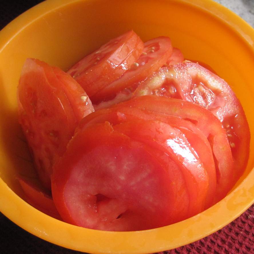 Affettare i pomodori e metterli a scolare l'acqua in uno scolapasta.