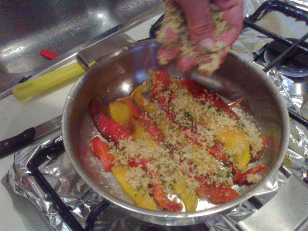 "coperchio chiuso" pangrattato, prezzemolo, capperi, olio, sale, pepe ed infine l'acqua, tritare 10 sec vel 5, deve risultare un composto abbastanza morbido, altrimenti aggiungere un pochino d'acqua.In una pirofila rotonda spennellata con un po' d'olio distribuire i peperoni tagliati a listarelle, formare degli strati cospargendo su ognuno un po' del composto preparato. Al centro dell'ultimo strato infilare, se gradito, uno spicchio d'aglio sbucciato. Irrorare con un po' d'olio a filo e infornare a 200° per una ventina di minuti.